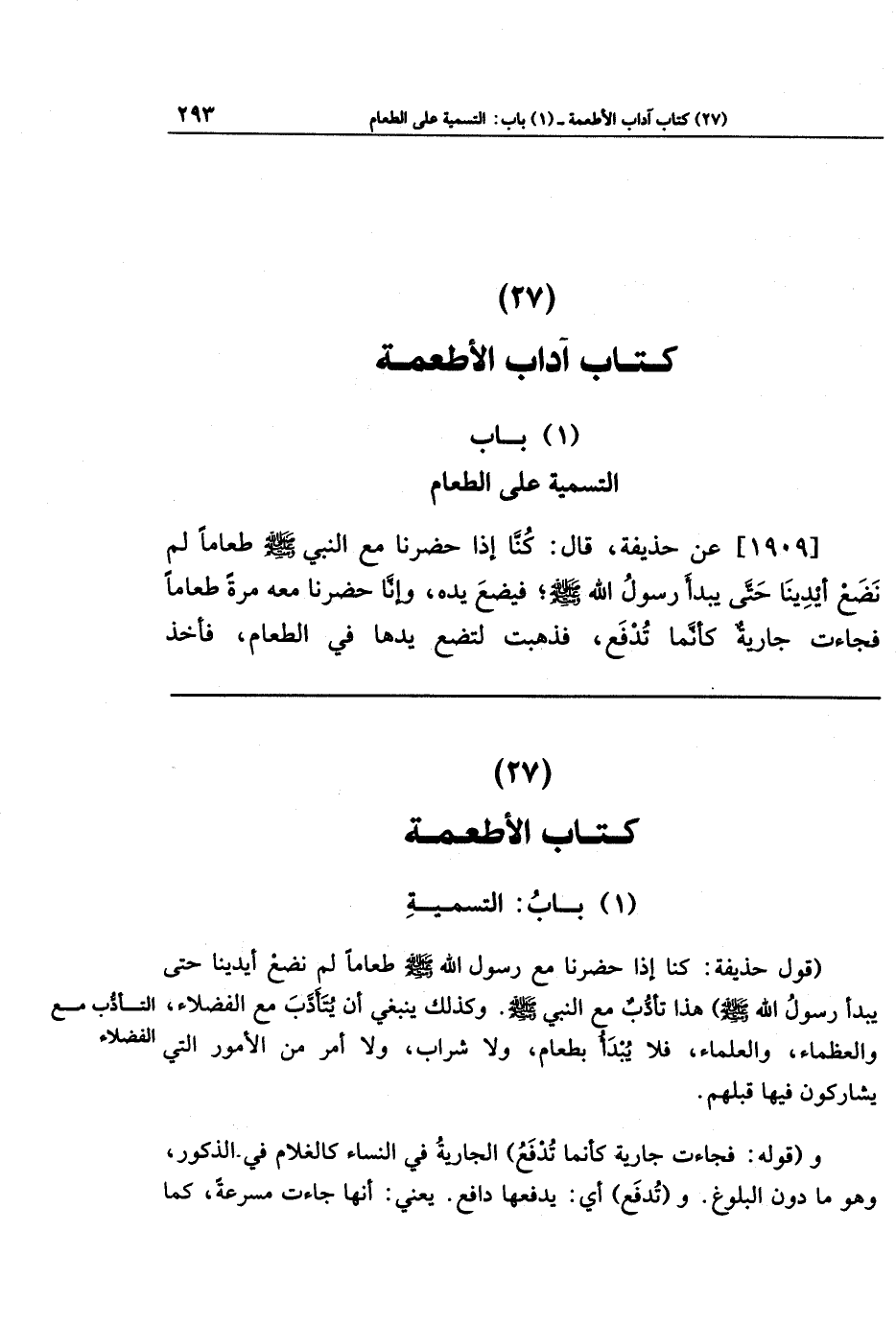 [1909] عَن حُذَيفَةَ قَالَ: كُنَّا إِذَا حَضَرنَا مَعَ النَّبِيِّ صَلَّى اللَّهُ عَلَيهِ وَسَلَّمَ طَعَامًا، لَم نَضَع أَيدِيَنَا حَتَّى يَبدَأَ رَسُولُ اللَّهِ صَلَّى اللَّهُ عَلَيهِ وَسَلَّمَ فَيَضَعَ يَدَهُ، وَإِنَّا حَضَرنَا مَعَهُ مَرَّةً طَعَامًا، فَجَاءَت جَارِيَةٌ كَأَنَّما تُدفَعُ، فَذَهَبَت لِتَضَعَ يَدَهَا فِي الطَّعَامِ، فَأَخَذَ
