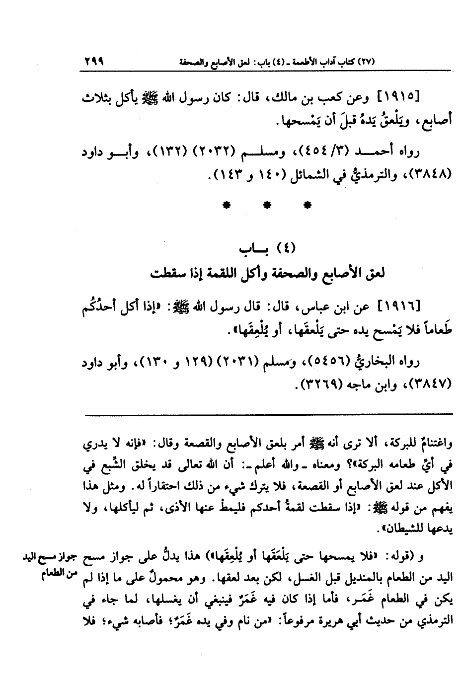 [1916] عَن ابنِ عَبَّاسٍ قَالَ: قَالَ رَسُولُ اللَّهِ صَلَّى اللهُ عَلَيهِ وَسَلَّمَ: إِذَا أَكَلَ أَحَدُكُم طَعَامًا فَلَا يَمسَح يَدَهُ حَتَّى يَلعَقَهَا أَو يُلعِقَهَا.