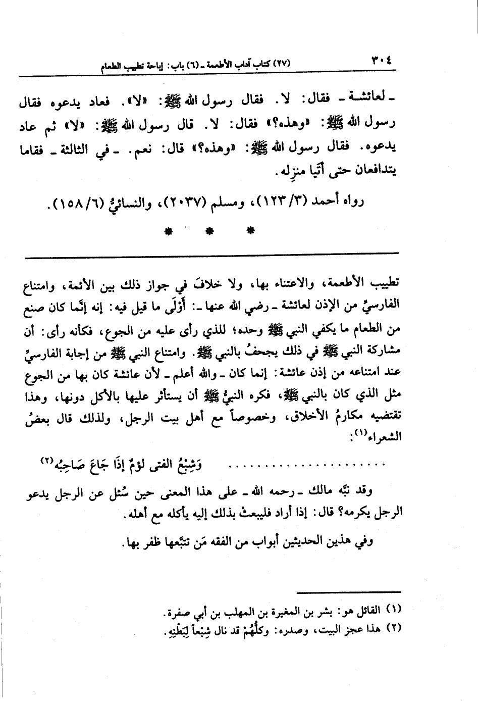 تطييب الأطعمة، والاعتناء بها، ولا خلاف في جواز ذلك بين الأئمة، وامتناع الفارسي من الإذن لعائشة - رضي الله عنها -: أولى ما قيل فيه: إنه إنَّما كان صنع من الطعام ما يكفي النبي - صلى الله عليه وسلم - وحده؛ للذي رأى عليه من الجوع، فكأنه رأى: أن مشاركة النبي - صلى الله عليه وسلم - في ذلك يجحف بالنبي - صلى الله عليه وسلم -. وامتناع النبي - صلى الله عليه وسلم - من إجابة الفارسي عند امتناعه من إذن عائشة: إنما كان - والله أعلم - لأن عائشة كان بها من الجوع مثل الذي كان بالنبي - صلى الله عليه وسلم -، فكره النبي - صلى الله عليه وسلم - أن يستأثر عليها بالأكل دونها، وهذا تقتضيه مكارم الأخلاق، وخصوصًا مع أهل بيت الرجل، ولذلك قال بعض الشعراء (¬1):