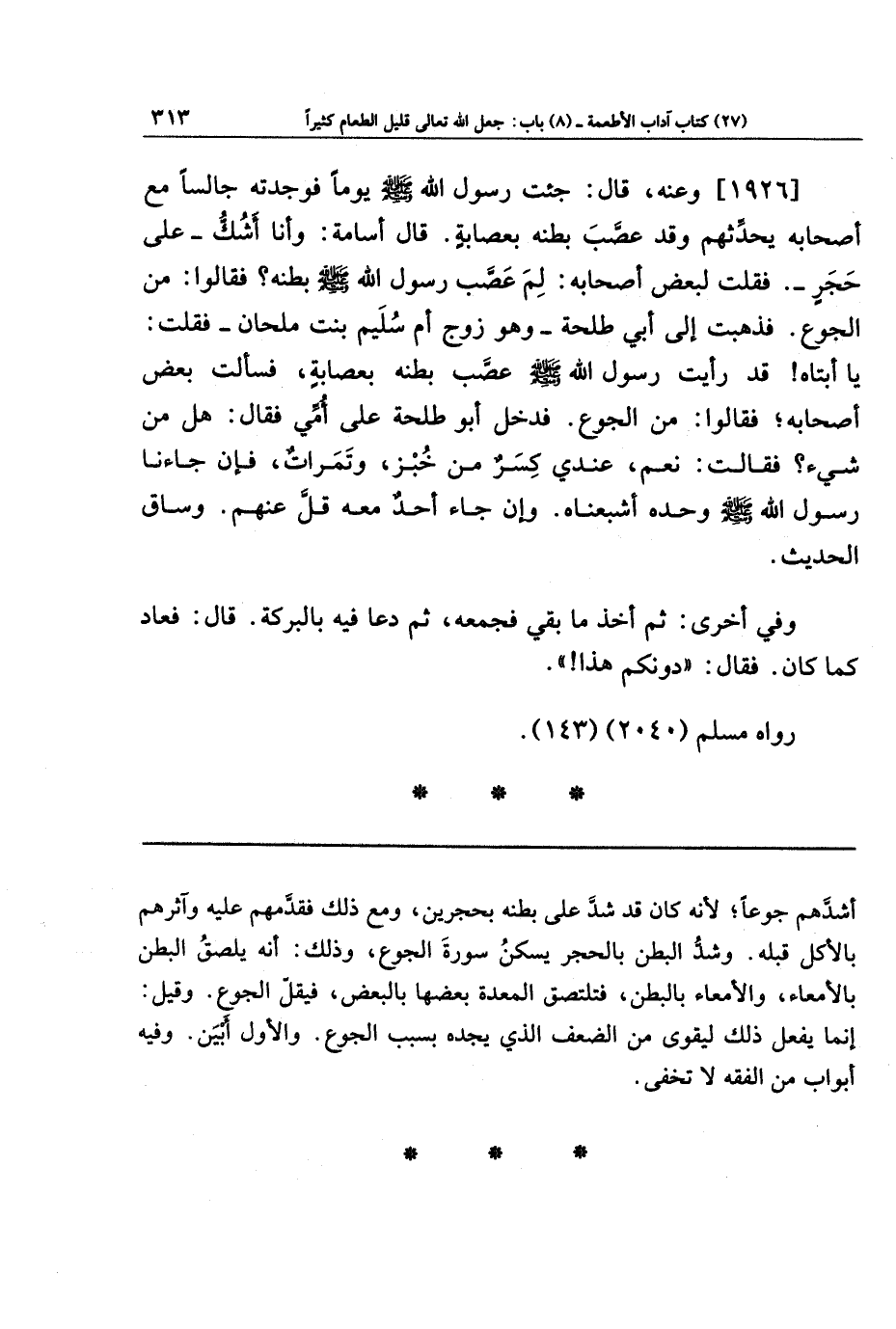 [1926] وعنه، قال: جِئتُ رَسُولَ اللَّهِ صَلَّى اللَّهُ عَلَيهِ وَسَلَّمَ يَومًا فَوَجَدتُهُ جَالِسًا مَعَ أَصحَابِهِ يُحَدِّثُهُم، وَقَد عَصَّبَ بَطنَهُ بِعِصَابَةٍ، قَالَ أُسَامَةُ: وَأَنَا أَشُكُّ - عَلَى حَجَرٍ - فَقُلتُ لِبَعضِ أَصحَابِهِ: لِمَ عَصَّبَ رَسُولُ اللَّهِ صَلَّى اللَّهُ عَلَيهِ وَسَلَّمَ بَطنَهُ؟ فَقَالَوا: مِن الجُوعِ، فَذَهَبتُ إِلَى أَبِي طَلحَةَ، وَهُوَ زَوجُ أُمِّ سُلَيمٍ بِنتِ مِلحَانَ، فَقُلتُ: يَا أَبَتَاهُ، قَد رَأَيتُ رَسُولَ اللَّهِ صَلَّى اللَّهُ عَلَيهِ وَسَلَّمَ عَصَّبَ بَطنَهُ بِعِصَابَةٍ، فَسَأَلتُ بَعضَ أَصحَابِهِ فَقَالَوا: مِن الجُوعِ، فَدَخَلَ أَبُو طَلحَةَ عَلَى أُمِّي فَقَالَ: هَل مِن شَيءٍ؟ فَقَالَت: نَعَم، عِندِي كِسَرٌ مِن خُبزٍ، وَتَمَرَاتٌ، فَإِن جَاءَنَا رَسُولُ اللَّهِ صَلَّى اللَّهُ عَلَيهِ وَسَلَّمَ وَحدَهُ أَشبَعنَاهُ، وَإِن جَاءَ أحد مَعَهُ قَلَّ عَنهُم، وساق الحديث.