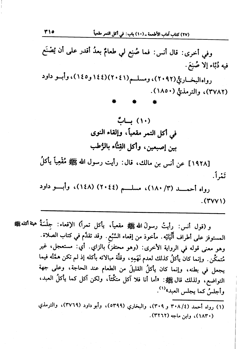 [1928] عن أَنَس بن مَالِكٍ قَالَ: رَأَيتُ رسول الله صَلَّى اللَّهُ عَلَيهِ وَسَلَّمَ مُقعِيًا يَأكُلُ تَمرًا.