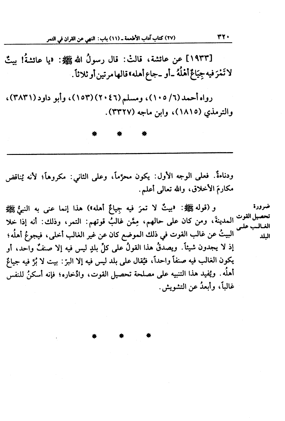 [1933] عَن عَائِشَةَ قَالَت: قَالَ رَسُولُ اللَّهِ صَلَّى اللهُ عَلَيهِ وَسَلَّمَ: يَا عَائِشَةُ، بَيتٌ لَا تَمرَ فِيهِ جِيَاعٌ أَهلُهُ - أَو - جَاعَ أَهلُهُ، قَالَهَا مَرَّتَينِ أَو ثَلَاثًا.