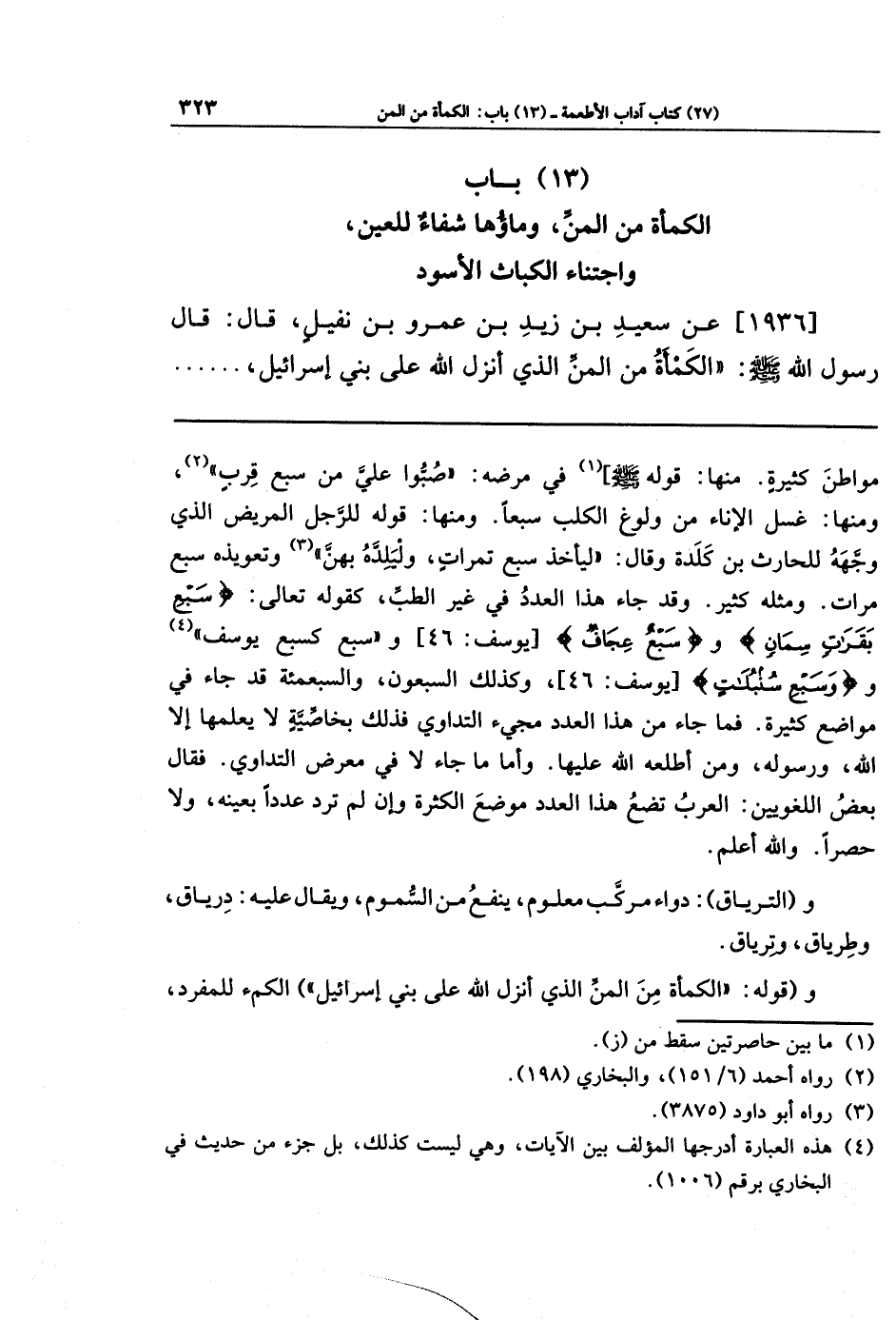 [1936] عَن سَعِيدِ بنِ زَيدِ بنِ عَمرِو بنِ نُفَيلٍ قَالَ: قَالَ رَسُولُ اللَّهِ صَلَّى اللهُ عَلَيهِ وَسَلَّمَ: الكَمأَةُ مِن المَنِّ الَّذِي أَنزَلَ اللَّهُ عَلَى بَنِي إِسرَائِيلَ،