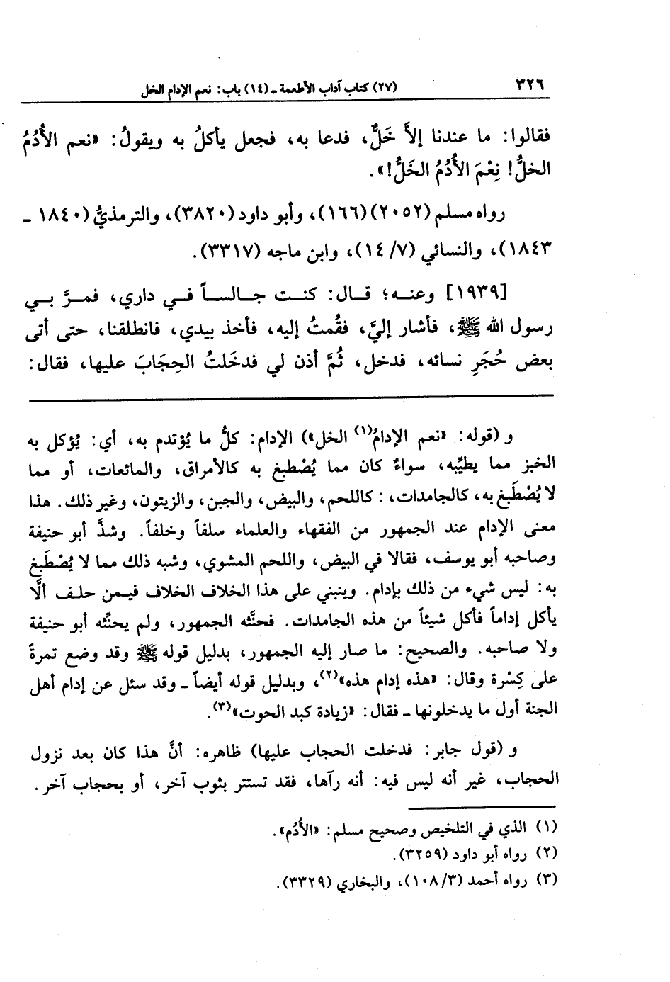 [1939] وعنه؛ قَالَ: كُنتُ جَالِسًا فِي دَارِي، فَمَرَّ بِي رَسُولُ اللَّهِ صَلَّى اللهُ عَلَيهِ وَسَلَّمَ، فَأَشَارَ إِلَيَّ، فَقُمتُ إِلَيهِ، فَأَخَذَ بِيَدِي، فَانطَلَقنَا، حَتَّى أَتَى بَعضَ حُجَرِ نِسَائِهِ، فَدَخَلَ، ثُمَّ أَذِنَ لِي فَدَخَلتُ الحِجَابَ عَلَيهَا، فَقَالَ: