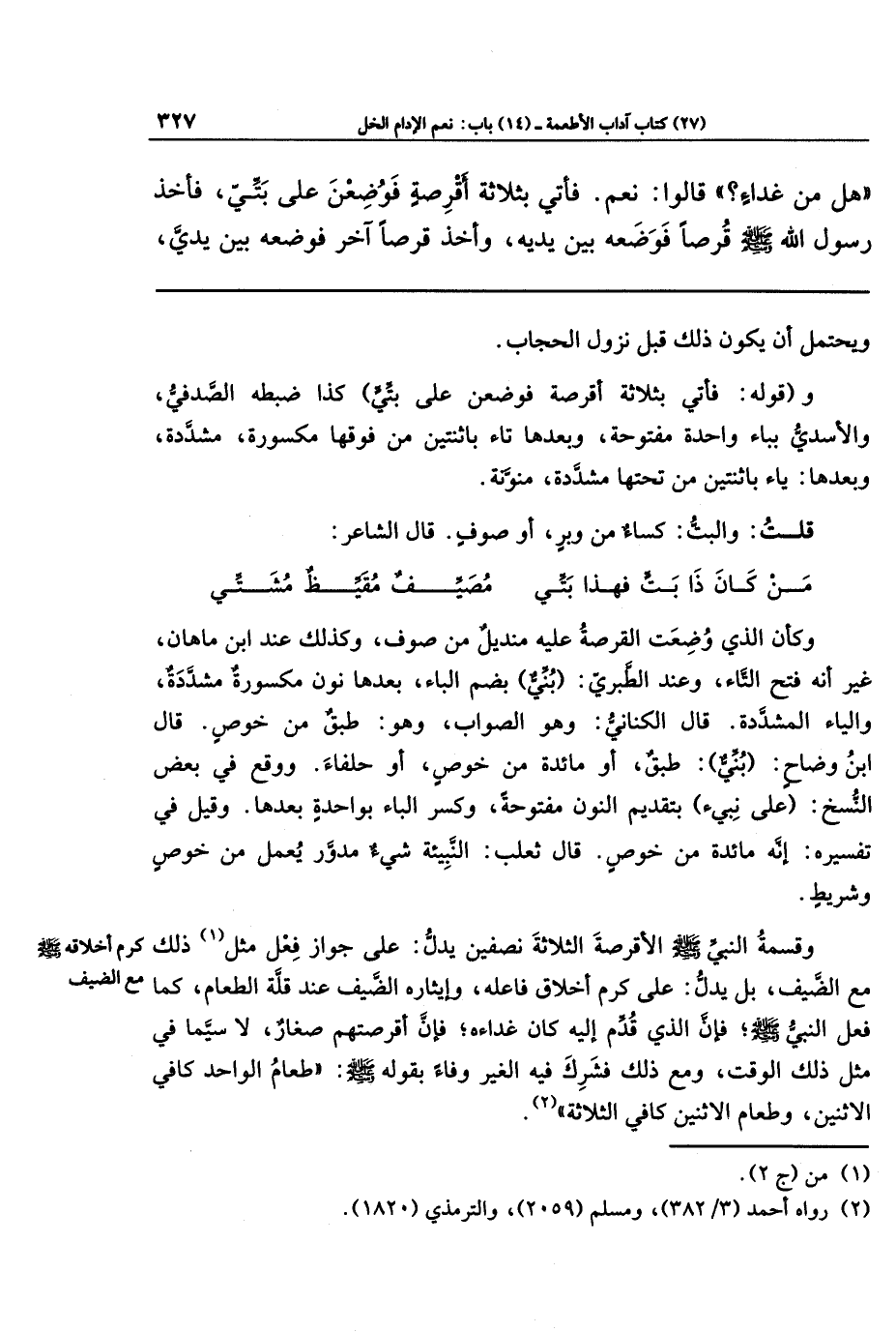 وكأن الذي وضعت القرصة عليه منديل من صوف، وكذلك عند ابن ماهان، غير أنه فتح التاء، وعند الطبري: (بُني) بضم الباء، بعدها نون مكسورة مشددة، والياء المشدَّدة. قال الكناني: وهو الصواب، وهو: طبق من خوص. قال ابن وضاح: (بُني): طبق، أو مائدة من خوص، أو حلفاء. ووقع في بعض النسخ: (على نبيء) بتقديم النون مفتوحة، وكسر الباء بواحدة بعدها. وقيل في تفسيره: إنَّه مائدة من خوص. قال ثعلب: النبيئة شيء مدوَّر يعمل من خوص وشريط.
