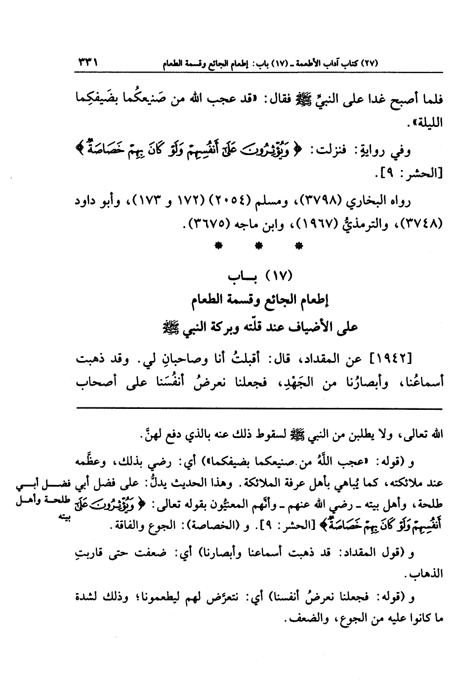 (17) باب إطعام الجائع وقسمة الطعام على الأضياف عند قلته، وبركة النبي صَلَّى اللَّهُ عَلَيهِ وَسَلَّمَ