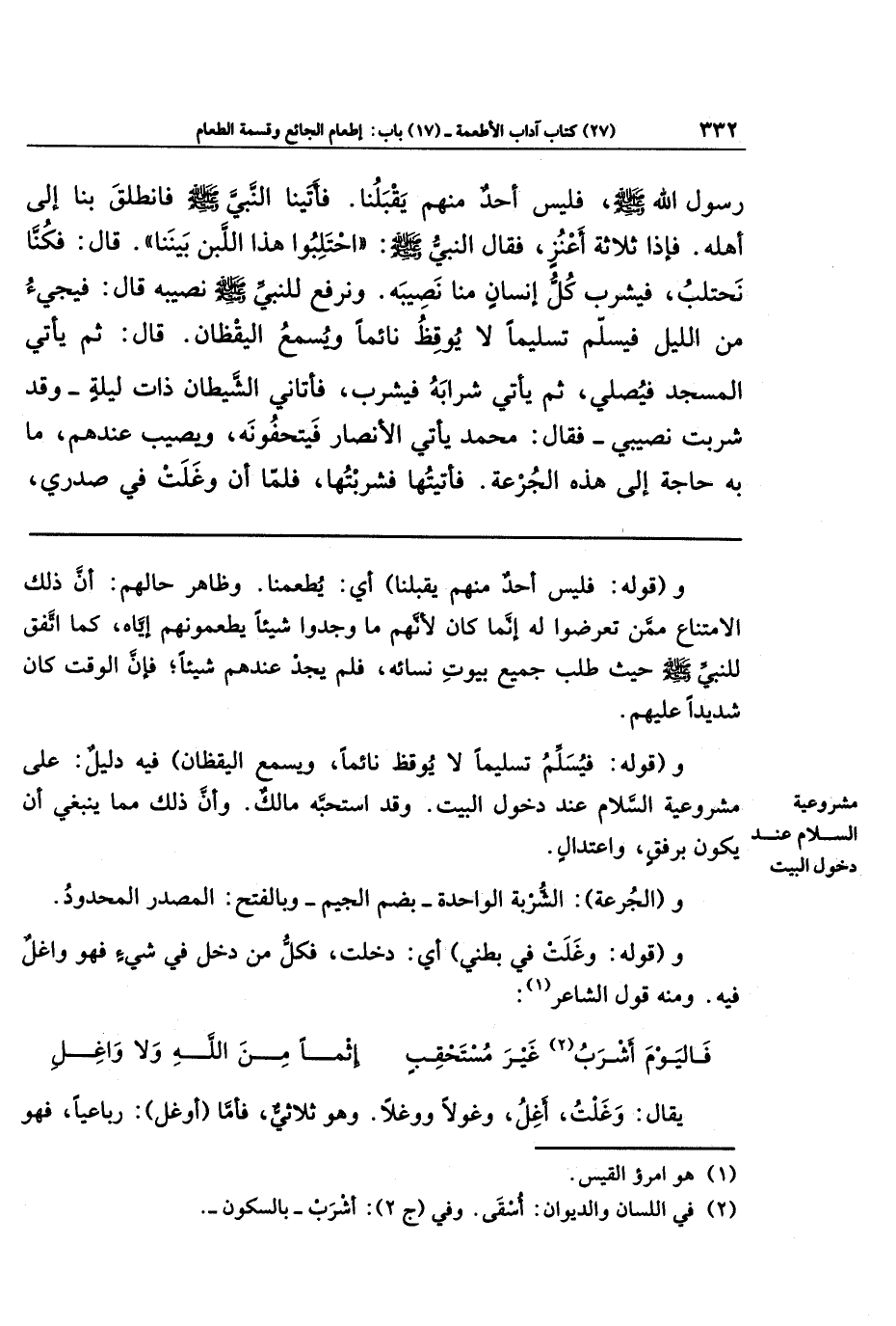 رَسُولِ اللَّهِ صَلَّى اللهُ عَلَيهِ وَسَلَّمَ، فَلَيسَ أَحَدٌ مِنهُم يَقبَلُنَا، فَأَتَينَا النَّبِيَّ صَلَّى اللَّهُ عَلَيهِ وَسَلَّمَ فَانطَلَقَ بِنَا إِلَى أَهلِهِ، فَإِذَا ثَلَاثَةُ أَعنُزٍ، فَقَالَ النَّبِيُّ صَلَّى اللهُ عَلَيهِ وَسَلَّمَ: احتَلِبُوا هَذَا اللَّبَنَ بَينَنَا. قَالَ: فَكُنَّا نَحتَلِبُ، فَيَشرَبُ كُلُّ إِنسَانٍ مِنَّا نَصِيبَهُ، وَنَرفَعُ لِلنَّبِيِّ صَلَّى اللَّهُ عَلَيهِ وَسَلَّمَ نَصِيبَهُ، قَالَ: فَيَجِيءُ مِن اللَّيلِ فَيُسَلِّمُ تَسلِيمًا لَا يُوقِظُ نَائِمًا، وَيُسمِعُ اليَقظَانَ، قَالَ: ثُمَّ يَأتِي المَسجِدَ فَيُصَلِّي، ثُمَّ يَأتِي شَرَابَهُ فَيَشرَبُ، فَأَتَانِي الشَّيطَانُ ذَاتَ لَيلَةٍ وَقَد شَرِبتُ نَصِيبِي، فَقَالَ: مُحَمَّدٌ يَأتِي الأَنصَارَ فَيُتحِفُونَهُ وَيُصِيبُ عِندَهُم، مَا بِهِ حَاجَةٌ إِلَى هَذِهِ الجُرعَةِ، فَأَتَيتُهَا فَشَرِبتُهَا، فَلَمَّا أَن وَغَلَت فِي صدري،