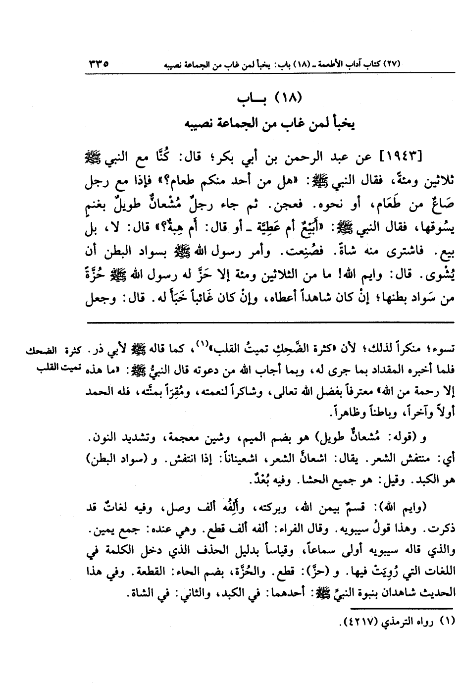 [1943] عَن عَبدِ الرَّحمَنِ بنِ أَبِي بَكرٍ قَالَ: كُنَّا مَعَ النَّبِيِّ صَلَّى اللَّهُ عَلَيهِ وَسَلَّمَ ثَلَاثِينَ وَمِائَةً، فَقَالَ النَّبِيُّ صَلَّى اللهُ عَلَيهِ وَسَلَّمَ: هَل مِن أَحَدٍ مِنكُم طَعَامٌ؟ . فَإِذَا مَعَ رَجُلٍ صَاعٌ مِن طَعَامٍ أَو نَحوُهُ، فَعُجِنَ، ثُمَّ جَاءَ رَجُلٌ مُشعَانٌّ طَوِيلٌ بِغَنَمٍ يَسُوقُهَا، فَقَالَ النَّبِيُّ صَلَّى اللهُ عَلَيهِ وَسَلَّمَ: أَبَيعٌ أَم عَطِيَّةٌ؟ . أَو قَالَ: أَم هِبَةٌ؟ قَالَ: لَا، بَل بَيعٌ. فَاشتَرَى مِنهُ شَاةً فَصُنِعَت، وَأَمَرَ رَسُولُ اللَّهِ صَلَّى اللَّهُ عَلَيهِ وَسَلَّمَ بِسَوَادِ البَطنِ أَن يُشوَى. قَالَ: وَايمُ اللَّهِ، مَا مِن الثَّلَاثِينَ وَمِائَةٍ إِلَّا حَزَّ لَهُ رَسُولُ اللَّهِ صَلَّى اللَّهُ عَلَيهِ وَسَلَّمَ حُزَّةً مِن سَوَادِ بَطنِهَا، إِن كَانَ شَاهِدًا أَعطَاهُ، وَإِن كَانَ غَائِبًا خَبَأَ لَهُ. قَالَ: وَجَعَلَ