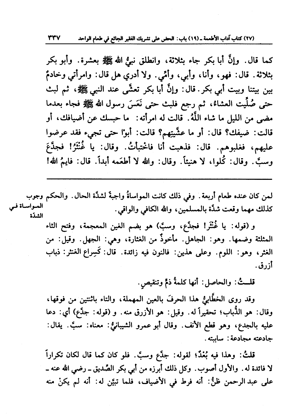 كَمَا قَالَ: وَإِنَّ أَبَا بَكرٍ جَاءَ بِثَلَاثَةٍ، وَانطَلَقَ نَبِيُّ اللَّهِ صَلَّى اللَّهُ عَلَيهِ وَسَلَّمَ بِعَشَرَةٍ، وَأَبُو بَكرٍ بِثَلَاثَةٍ، قَالَ: فَهُوَ وَأَنَا وَأَبِي وَأُمِّي، وَلَا أَدرِي هَل قَالَ: وَامرَأَتِي وَخَادِمٌ بَينَ بَيتِنَا وَبَيتِ أَبِي بَكرٍ. قَالَ: وَإِنَّ أَبَا بَكرٍ تَعَشَّى عِندَ النَّبِيِّ صَلَّى اللهُ عَلَيهِ وَسَلَّمَ، ثُمَّ لَبِثَ حَتَّى صُلِّيَت العِشَاءُ، ثُمَّ رَجَعَ فَلَبِثَ حَتَّى نَعَسَ رَسُولُ اللَّهِ صَلَّى اللهُ عَلَيهِ وَسَلَّمَ، فَجَاءَ بَعدَمَا مَضَى مِن اللَّيلِ مَا شَاءَ اللَّهُ. قَالَت لَهُ امرَأَتُهُ: مَا حَبَسَكَ عَن أَضيَافِكَ؟ أَو قَالَت: ضَيفِكَ. قَالَ: أَوَمَا عَشَّيتِهِم؟ قَالَت: أَبَوا حَتَّى تَجِيءَ، فَقَد عَرَضُوا عَلَيهِم فَغَلَبُوهُم. قَالَ: فَذَهَبتُ أَنَا فَاختَبَأتُ، وَقَالَ: يَا غُنثَرُ، فَجَدَّعَ وَسَبَّ، وَقَالَ: كُلُوا، لَا هَنِيئًا، وَقَالَ: وَاللَّهِ لَا أَطعَمُهُ أَبَدًا. قَالَ: فَايمُ اللَّهِ،