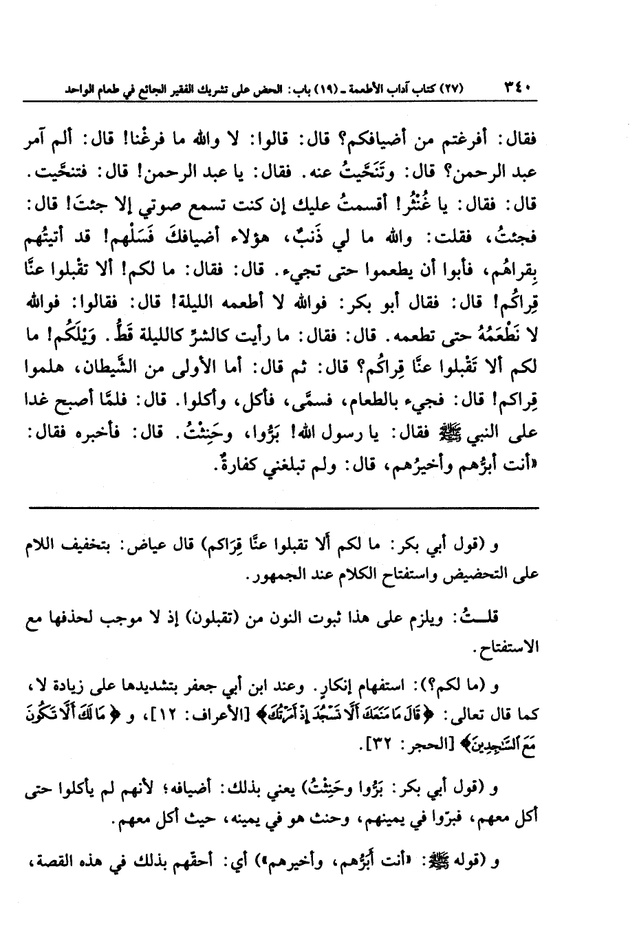 فَقَالَ: أَفَرَغتُم مِن أَضيَافِكُم؟ قَالَ: قَالَوا: لَا وَاللَّهِ مَا فَرَغنَا، قَالَ: أَلَم آمُر عَبدَ الرَّحمَنِ؟ قَالَ: وَتَنَحَّيتُ عَنهُ، فَقَالَ: يَا عَبدَ الرَّحمَنِ، قَالَ: فَتَنَحَّيتُ، قَالَ: فَقَالَ: يَا غُنثَرُ، أَقسَمتُ عَلَيكَ إِن كُنتَ تَسمَعُ صَوتِي إِلَّا جِئتَ. قَالَ: فَجِئتُ فَقُلتُ: وَاللَّهِ مَا لِي ذَنبٌ، هَؤُلَاءِ أَضيَافُكَ فَسَلهُم، قَد أَتَيتُهُم بِقِرَاهُم فَأَبَوا أَن يَطعَمُوا حَتَّى تَجِيءَ. قَالَ: فَقَالَ: مَا لَكُم أَلَا تَقبَلُوا عَنَّا قِرَاكُم؟ قَالَ: فَقَالَ أَبُو بَكرٍ: فَوَاللَّهِ لَا أَطعَمُهُ اللَّيلَةَ. قَالَ: فَقَالَوا: فَوَاللَّهِ لَا نَطعَمُهُ حَتَّى تَطعَمَهُ. قَالَ: فقال: مَا رَأَيتُ كَالشَّرِّ كَاللَّيلَةِ قَطُّ. وَيلَكُم، مَا لَكُم أَلَا تَقبَلُوا عَنَّا قِرَاكُم؟ قَالَ: ثُمَّ قَالَ: أَمَّا الأُولَى مِن الشَّيطَانِ، هَلُمُّوا قِرَاكُم. قَالَ: فَجِيءَ بِالطَّعَامِ فَسَمَّى فَأَكَلَ وَأَكَلُوا. قَالَ: فَلَمَّا أَصبَحَ غَدَا عَلَى النَّبِيِّ صَلَّى اللَّهُ عَلَيهِ وَسَلَّمَ فَقَالَ: يَا رَسُولَ اللَّهِ، بَرُّوا وَحَنِثتُ، قَالَ: فَأَخبَرَهُ فَقَالَ: أَنتَ أَبَرُّهُم وَأَخيَرُهُم. قَالَ: وَلَم تَبلُغنِي كَفَّارَةٌ.