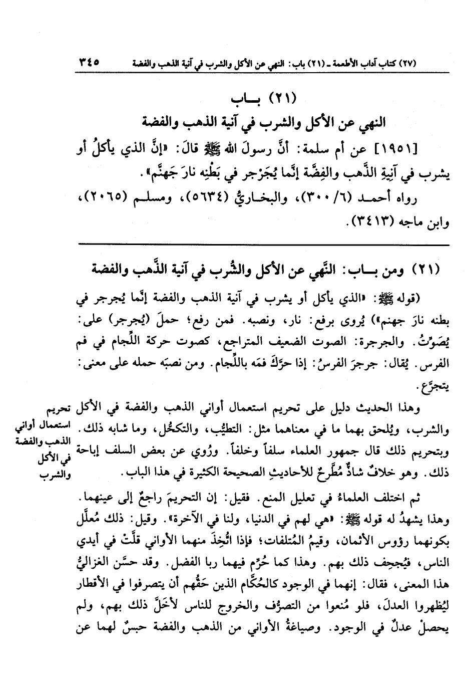 [1951] عَن أُمِّ سَلَمَةَ أَنَّ رَسُولَ اللَّهِ صَلَّى اللَّهُ عَلَيهِ وَسَلَّمَ قَالَ: إن الَّذِي يأكل أو يَشرَبُ فِي آنِيَةِ الذهب والفِضَّةِ، إِنَّمَا يُجَرجِرُ فِي بَطنِهِ نَارَ جَهَنَّمَ.