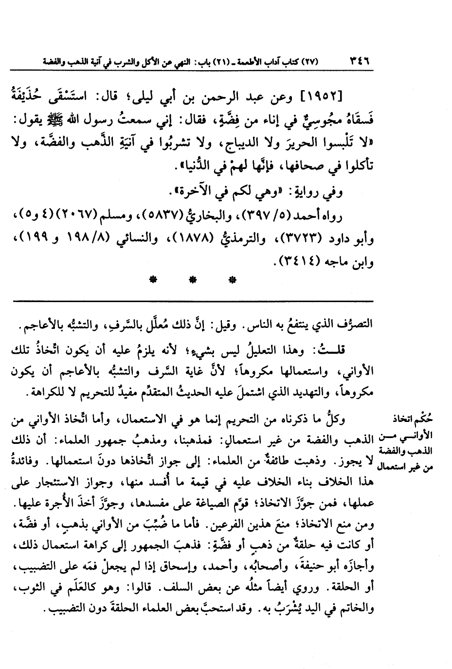 [1952] وعن عَبد الرَّحمَنِ بن أَبِي لَيلَى قَالَ: استَسقَى حُذَيفَةُ فَسَقَاهُ مَجُوسِيٌّ فِي إِنَاءٍ مِن فِضَّةٍ، فَقَالَ: إِنِّي سَمِعتُ رَسُولَ اللَّهِ صَلَّى اللَّهُ عَلَيهِ وَسَلَّمَ يَقُولُ: لَا تَلبَسُوا الحَرِيرَ وَلَا الدِّيبَاجَ، وَلَا تَشرَبُوا فِي آنِيَةِ الذَّهَبِ وَالفِضَّةِ، وَلَا تَأكُلُوا فِي صِحَافِهَا، فَإِنَّهَا لَهُم فِي الدُّنيَا.