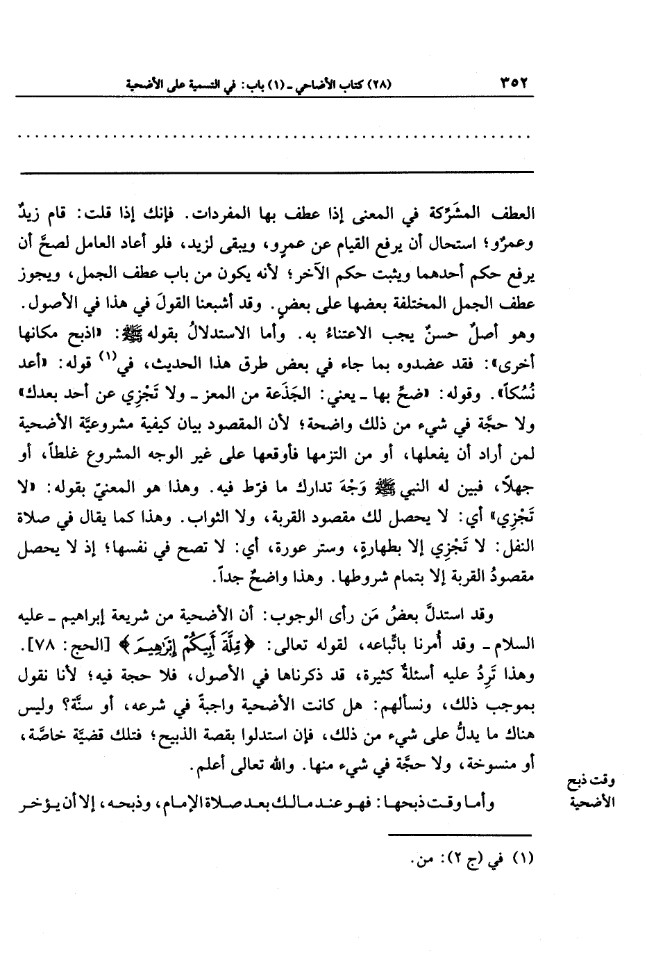 وقد استدلَّ بعض من رأى الوجوب: أن الأضحية من شريعة إبراهيم - عليه السلام - وقد أُمِرنا باتِّباعه، لقوله تعالى: {مِلَّةَ أَبِيكُم إِبرَاهِيمَ} وهذا ترد عليه أسئلة كثيرة، قد ذكرناها في الأصول، فلا حجة فيه؛ لأنَّا نقول بموجب ذلك، ونسألهم: هل كانت الأضحية واجبة في شرعه، أو سُنَّة؟ وليس هناك ما يدلّ على شيء من ذلك، فإنَّ استدلوا بقصة الذبيح؛ فتلك قضية خاصة، أو منسوخة، ولا حجة في شيء منها. والله تعالى أعلم.