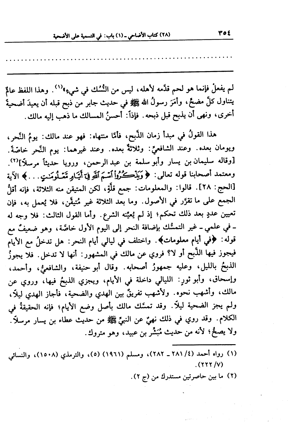 واختلف في ليالي أيام النحر: هل تدخل مع الأيام فيجوز فيها الذبح أو لا؟ فروي عن مالك في المشهور: أنها لا تدخل. فلا يجوز الذبح بالليل، وعليه جمهور أصحابه. وقال أبو حنيفة، والشافعي، وأحمد، وإسحاق، وأبو ثور: الليالي داخلة في الأيام، ويجزي الذبح فيها، وروي عن مالك، وأشهب نحوه. ولأشهب تفريق بين الهدي والضحية، فأجاز الهدي ليلًا، ولم يجز الضحية ليلًا. وقد تمسَّك مالك بأصل وضع الأيام؛ فإنَّه الحقيقة في الكلام. وقد روي في ذلك نهي عن النبي - صلى الله عليه وسلم - من حديث عطاء بن يسار مرسلًا، ولا يصح؛ لأنَّه من حديث مُبَشِّر بن عبيد، وهو متروك.