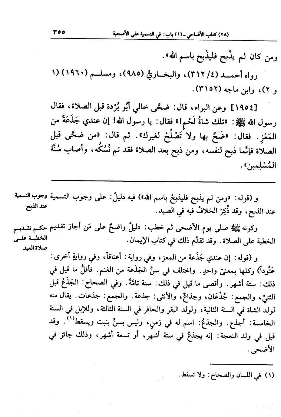 [1954] وعَن البَرَاءِ قَالَ: ضَحَّى خَالِي أَبُو بُردَةَ قَبلَ الصَّلَاةِ، فَقَالَ رَسُولُ اللَّهِ صَلَّى اللهُ عَلَيهِ وَسَلَّمَ: تِلكَ شَاةُ لَحمٍ. فَقَالَ: يَا رَسُولَ اللَّهِ، إِنَّ عِندِي جَذَعَةً مِن المَعزِ. فَقَالَ: ضَحِّ بِهَا، وَلَا تَصلُحُ لِغَيرِكَ. ثُمَّ قَالَ: مَن ضَحَّى قَبلَ الصَّلَاةِ فَإِنَّمَا ذَبَحَ لِنَفسِهِ، وَمَن ذَبَحَ بَعدَ الصَّلَاةِ فَقَد تَمَّ نُسُكُهُ، وَأَصَابَ سُنَّةَ المُسلِمِينَ.