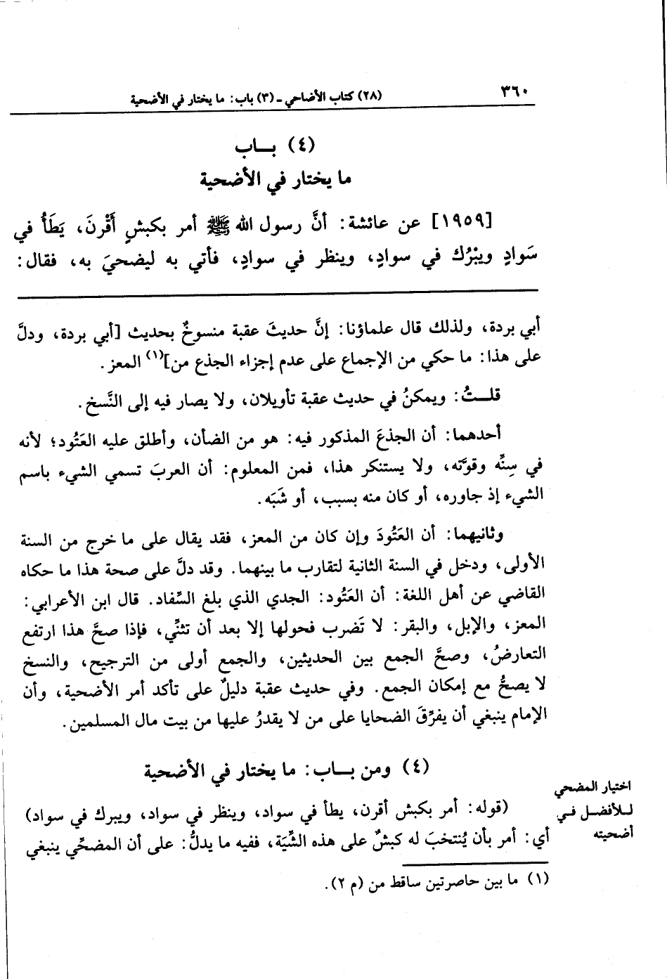 [1959] عَن عَائِشَةَ: أَنَّ رَسُولَ اللَّهِ صَلَّى اللَّهُ عَلَيهِ وَسَلَّمَ أَمَرَ بِكَبشٍ أَقرَنَ، يَطَأُ فِي سَوَادٍ، وَيَبرُكُ فِي سَوَادٍ، وَيَنظُرُ فِي سَوَادٍ، فَأُتِيَ بِهِ لِيُضَحِّيَ بِهِ، فَقَالَ: