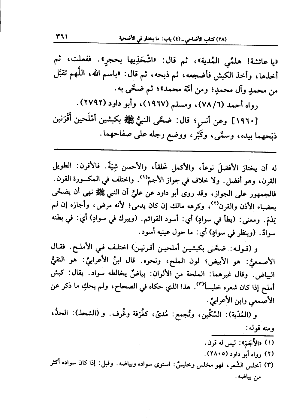 و(قوله: ضحَّى بكبشين أملحين أقرنين) اختلف في الأملح. فقال الأصمعي: هو الأبيض؛ لون الملح، ونحوه. قال ابن الأعرابي: هو النقي البياض. وقال غيرهما: الملحة من الألوان: بياض يخالطه سواد. يقال: كبش أملح إذا كان شعره خليسًا (¬3). هذا الذي حكاه في الصحاح، ولم يحك ما ذكر عن الأصمعي وابن الأعرابي.