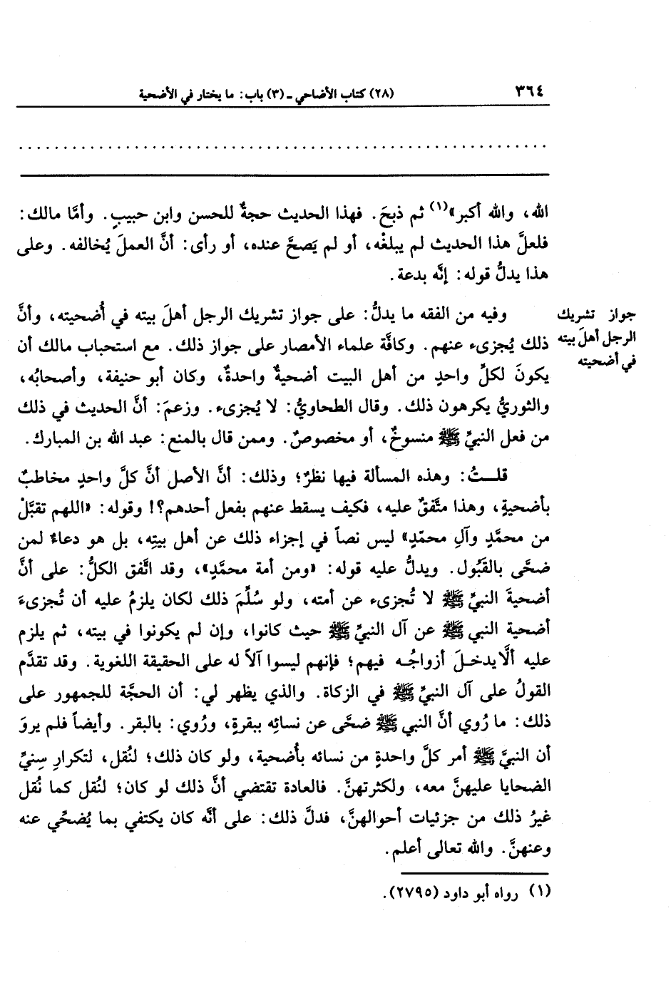 قلت: وهذه المسألة فيها نظر، وذلك: أن الأصل أن كل واحد مخاطب بأضحية، وهذا متفق عليه، فكيف يسقط عنهم بفعل أحدهم؟ ! وقوله: (اللهم تقبَّل من محمد وآل محمد) ليس نصًّا في إجزاء ذلك عن أهل بيته، بل هو دعاء لمن ضحَّى بالقبول. ويدلُّ عليه قوله: (ومن أمة محمد)، وقد اتَّفق الكل: على أن أضحية النبي - صلى الله عليه وسلم - لا تجزئ عن أمته، ولو سُلِّم ذلك لكان يلزم عليه أن تجزئ أضحية النبي - صلى الله عليه وسلم - عن آل النبي - صلى الله عليه وسلم - حيث كانوا، وإن لم يكونوا في بيته، ثم يلزم عليه ألا يدخل أزواجه فيهم؛ فإنَّهم ليسوا آلًا له على الحقيقة اللغوية. وقد تقدَّم القول على آل النبي - صلى الله عليه وسلم - في الزكاة. والذي يظهر لي: أن الحجَّة للجمهور على ذلك: ما روي أن النبي - صلى الله عليه وسلم - ضحَّى عن نسائه ببقرة، وروي: بالبقر. وأيضًا فلم يرو أن النبي - صلى الله عليه وسلم - أمر كل واحدة من نسائه بأضحية، ولو كان ذلك؛ لنقل، لتكرار سِنِي الضحايا عليهن معه، ولكثرتهن. فالعادة تقتضي أن ذلك لو كان؛ لنقل كما نقل غير ذلك من جزئيات أحوالهن، فدلَّ ذلك على أنَّه كان يكتفي بما يضحِّي عنه وعنهن. والله تعالى أعلم.