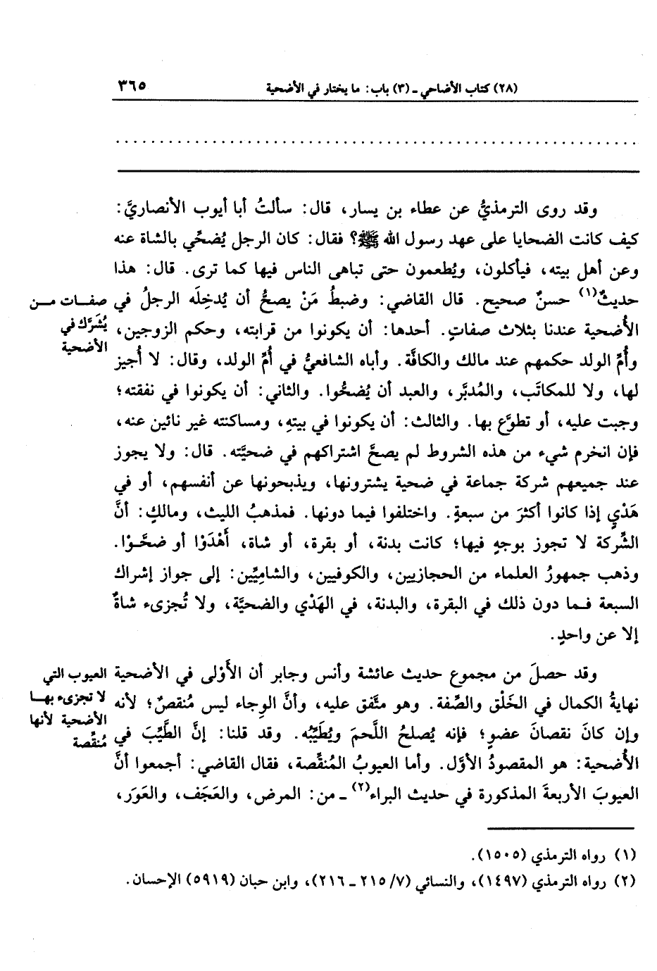 والثالث: أن يكونوا في بيته، ومساكنته غير نائين عنه، فإن انخرم شيء من هذه الشروط لم يصح اشتراكهم في ضحيَّته. قال: ولا يجوز عند جميعهم شركة جماعة في ضحية يشترونها، ويذبحونها عن أنفسهم، أو في هدي إذا كانوا أكثر من سبعة. واختلفوا فيما دونها. فمذهب الليث، ومالك: أن الشركة لا تجوز بوجهٍ فيها؛ كانت بدنة، أو بقرة، أو شاة، أَهدُوا أو ضحُّوا. وذهب جمهور العلماء من الحجازيين، والكوفيين، والشاميين: إلى جواز إشراك السبعة فما دون ذلك في البقرة، والبدنة، في الهدي والضحيَّة، ولا تجزئ شاة إلا عن واحد.