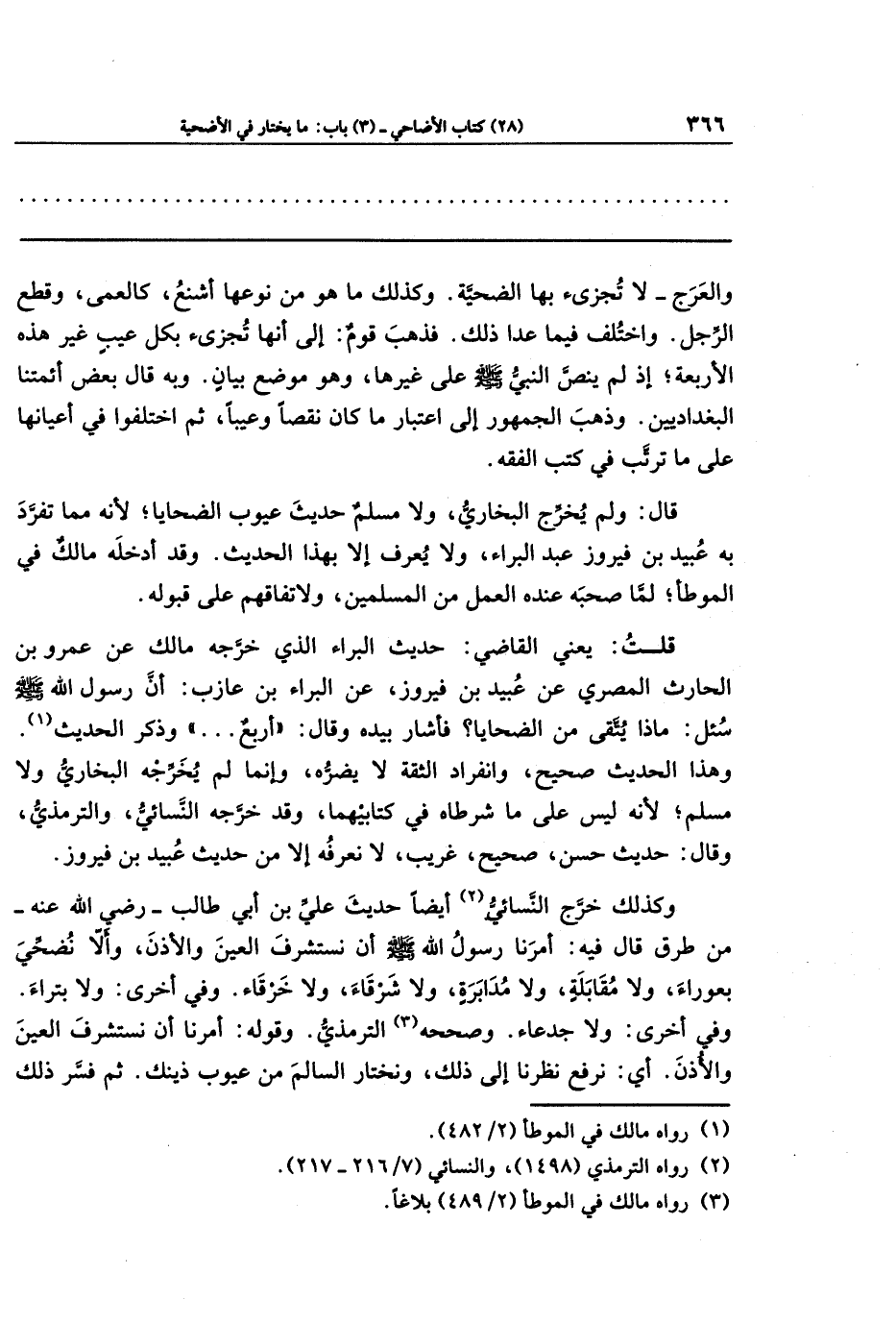 قال: ولم يخرج البخاري، ولا مسلم حديث عيوب الضحايا؛ لأنَّه مما تفرَّد به عبيد بن فيروز عن البراء، ولا يُعرف إلا بهذا الحديث. وقد أدخله مالك في الموطأ لما صحبه عنده العمل من المسلمين، ولاتفاقهم على قبوله.