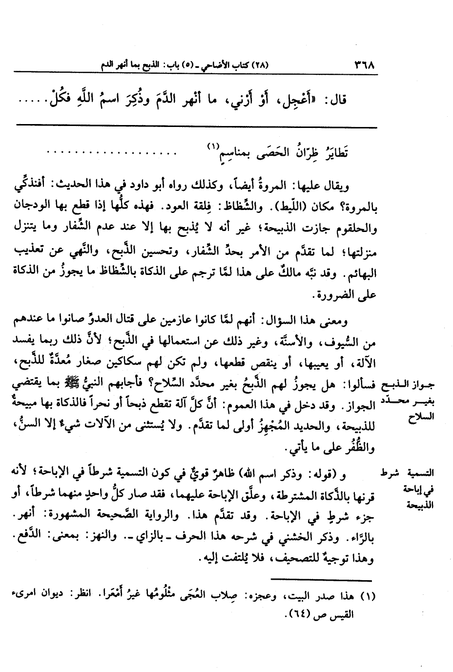 و(قوله: وذكر اسم الله) ظاهر قوي في كون شرطًا في الإباحة؛ لأنَّه قرنها بالذَّكاة المشترطة، وعلَّق الإباحة عليهما، فقد صار كل واحد منهما شرطًا، أو جزء شرط في الإباحة. وقد تقدَّم هذا. والرواية الصحيحة المشهورة: أنهر بالرَّاء. وذكر الخشني في شرحه هذا الحرف - بالزاي -. والنَّهز: بمعنى: الدَّفع. وهذا توجيهٌ للتصحيف، فلا يُلتفت إليه.