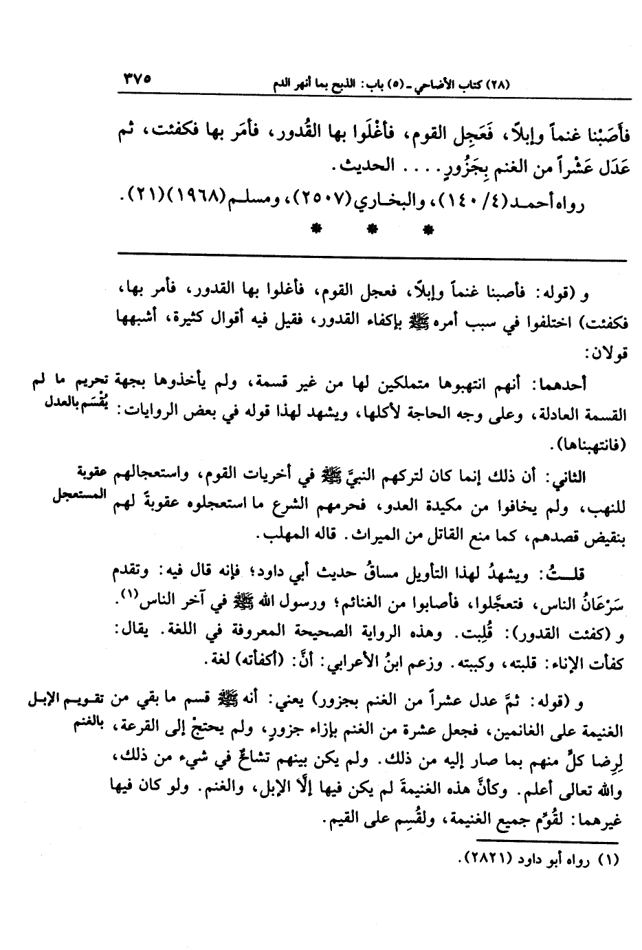 فَأَصَبنَا غَنَمًا وَإِبِلًا، فَعَجِلَ القَومُ، فَأَغلَوا بِهَا القُدُورَ، فَأَمَرَ بِهَا فَكُفِئَت، ثُمَّ عَدَلَ عَشرًا مِن الغَنَمِ بِجَزُورٍ ... الحديث.