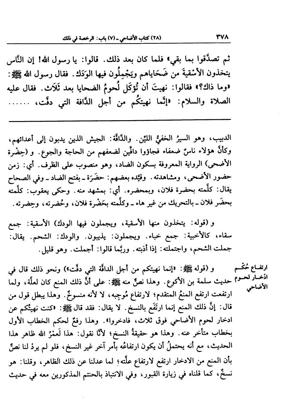 وقوله - صلى الله عليه وسلم -: (إنما نهيتكم من أجل الدافَّة التي دفَّت) ونحو ذلك قال في حديث سلمة بن الأكوع. وهذا نصٌّ منه - صلى الله عليه وسلم -: على أن ذلك المنع كان لعلَّة، ولما ارتفعت ارتفع المنع المتقدِّم؛ لارتفاع موجبه، لا لأنه منسوخ. وهذا يبطل قول من قال: إن ذلك المنع إنما ارتفع بالنسخ. لا يقال: فقد قال - صلى الله عليه وسلم -: (كنت نهيتكم عن ادِّخار لحوم الأضاحي فوق ثلاث، فادَّخروا). وهذا رفعٌ لحكم الخطاب الأول بخطاب متأخر عنه. وهذا هو حقيقة النسخ؛ لأنَّا نقول: هذا لَعمرُ الله! ظاهر هذا الحديث، مع أنه يحتمل أن يكون ارتفاعه بأمر آخر غير النسخ، فلو لم يَرِد لنا نصٌّ بأن المنع من الادِّخار ارتفع لارتفاع علّته؛ لما عدلنا عن ذلك الظاهر، وقلنا: هو نسخ، كما قلناه في زيارة القبور، وفي الانتباذ بالحنتم المذكورين معه في حديث