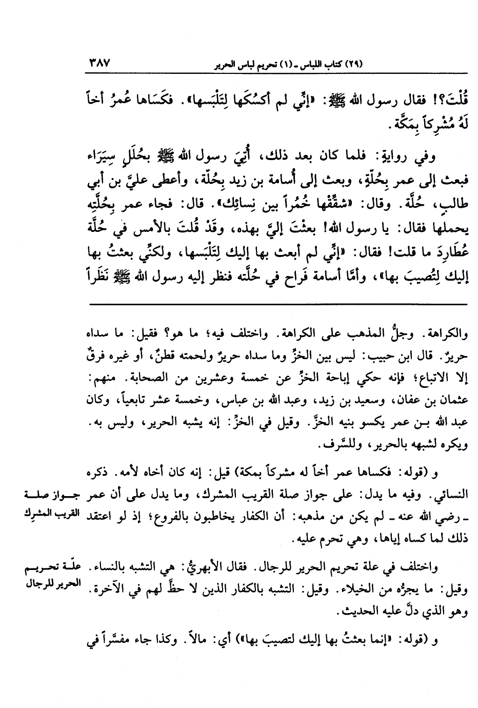 وفي رواية: فَلَمَّا كَانَ بَعدَ ذَلِكَ، أُتِيَ رَسُولُ اللَّهِ صَلَّى اللَّهُ عَلَيهِ وَسَلَّمَ بِحُلَلٍ سِيَرَاءَ، فَبَعَثَ إِلَى عُمَرَ بِحُلَّةٍ، وَبَعَثَ إِلَى أُسَامَةَ بنِ زَيدٍ بِحُلَّةٍ، وَأَعطَى عَلِيَّ بنَ أَبِي طَالِبٍ حُلَّةً، وَقَالَ: شَقِّقهَا خُمُرًا بَينَ نِسَائِكَ. قَالَ: فَجَاءَ عُمَرُ بِحُلَّتِهِ يَحمِلُهَا فَقَالَ: يَا رَسُولَ اللَّهِ، بَعَثتَ إِلَيَّ بِهَذِهِ، وَقَد قُلتَ بِالأَمسِ فِي حُلَّةِ عُطَارِدٍ مَا قُلتَ! فَقَالَ: إِنِّي لَم أَبعَث بِهَا إِلَيكَ لِتَلبَسَهَا، وَلَكِنِّي بَعَثتُ بِهَا إِلَيكَ لِتُصِيبَ بِهَا. وَأَمَّا أُسَامَةُ فَرَاحَ فِي حُلَّتِهِ، فَنَظَرَ إِلَيهِ رَسُولُ اللَّهِ صَلَّى اللَّهُ عَلَيهِ وَسَلَّمَ نَظَرًا