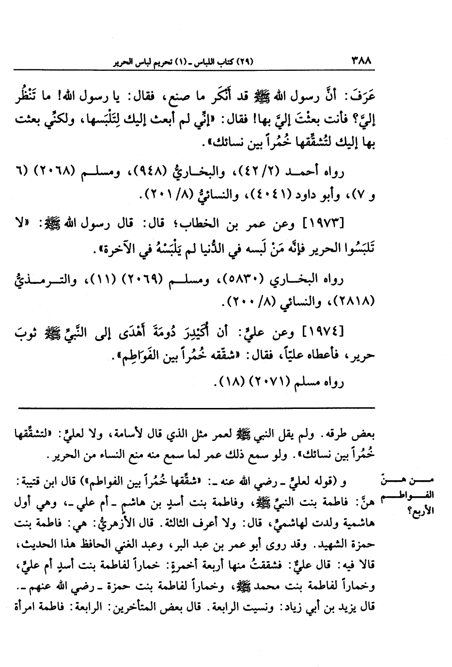 [1974] وعَن عَلِيٍّ: أَنَّ أُكَيدِرَ دُومَةَ أَهدَى إِلَى النَّبِيِّ صَلَّى اللَّهُ عَلَيهِ وَسَلَّمَ ثَوبَ حَرِيرٍ، فَأَعطَاهُ عَلِيًّا فَقَالَ: شَقِّقهُ خُمُرًا بَينَ الفَوَاطِمِ.