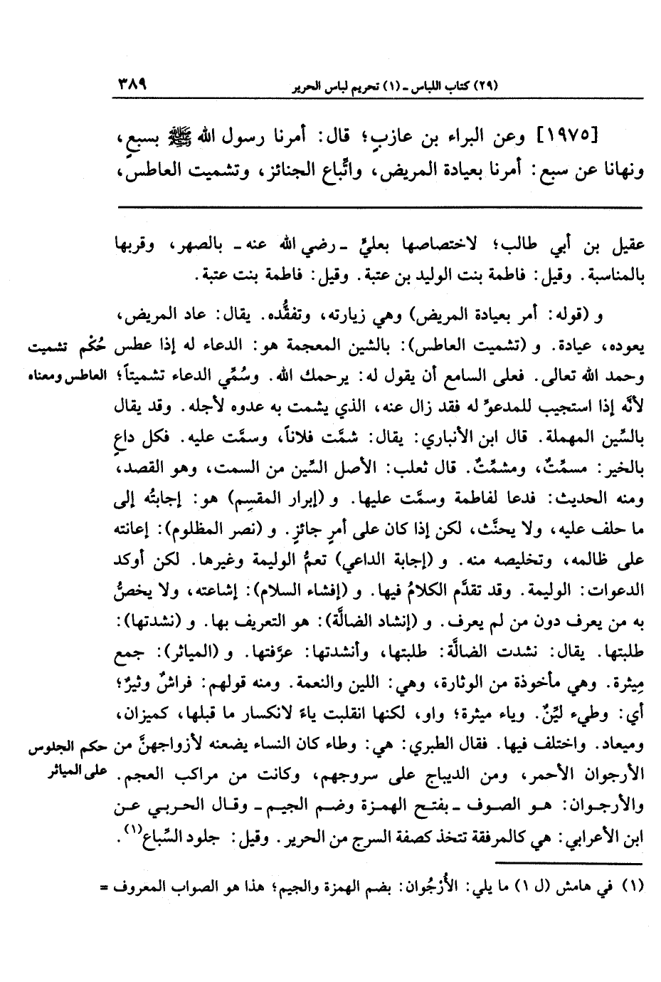 و(إبرار المقسم) هو: إجابته إلى ما حلف عليه، ولا يحنث، لكن إذا كان على أمر جائز. و (نصر المظلوم): إعانته على ظالمه، وتخليصه منه. و (إجابة الداعي) تعم الوليمة وغيرها. لكن أوكد الدعوات: الوليمة. وقد تقدَّم الكلام فيها. و (إفشاء السلام): إشاعته، ولا يخص به من يعرف دون من لم يعرف. و (إنشاد الضالَّة): هو التعريف بها. و (نشدتها): طلبتها. يقال: نشدت الضالَّة: طلبتها، وأنشدتها: عرَّفتها. و (المياثر): جمع ميثرة. وهي مأخوذة من الوثارة، وهي: اللين والنعمة. ومنه قولهم: فراش وثير؛ أي: وطيء لين. وياء ميثرة؛ واو، لكنها انقلبت ياء لانكسار ما قبلها، كميزان، وميعاد.