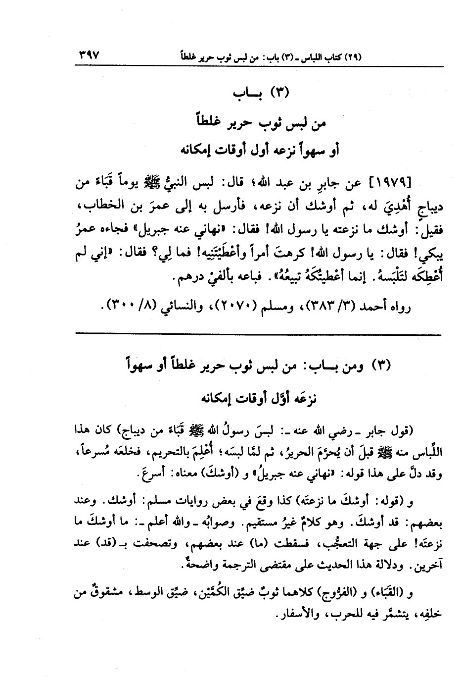 (3) باب من لبس ثوب حرير غلطا أو سهوا نزعه أول أوقات إمكانه
