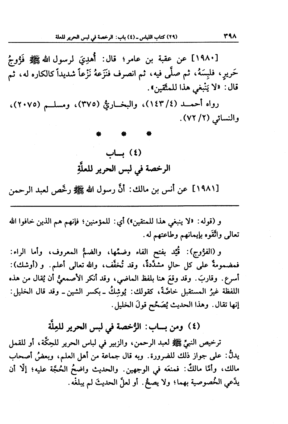 [1981] عن أَنَس بن مَالِكٍ: أَنَّ رَسُولَ اللَّهِ صَلَّى اللَّهُ عَلَيهِ وَسَلَّمَ رَخَّصَ لِعَبدِ الرَّحمَنِ