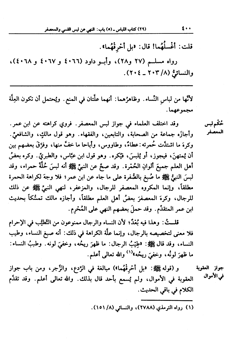 وقد اختلف العلماء في جواز لبس المعصفر. فروي كراهته عن ابن عمر. وأجازه جماعة من الصحابة، والتابعين، والفقهاء. وهو قول مالك، والشافعي. وكره ما اشتدَّت حمرته: عطاء وطاووس، وأباحا ما خف منها، وفرَّق بعضهم بين أن يمتهن، فيجوز أو يلبس، فيكره. وهو قول ابن عباس، والطبري. وكره بعض أهل العلم جميع ألوان الحمرة. وقد صحَّ عن النبي - صلى الله عليه وسلم - أنه لبس حلَّة حمراء، وقد لبس النبي - صلى الله عليه وسلم - ما صبغ بالصفرة على ما جاء عن ابن عمر، فلا وجه لكراهة الحمرة مطلقًا، وإنَّما المكروه المعصفر للرجال، والمزعفر؛ لنهي النبي - صلى الله عليه وسلم - عن ذلك للرجال، وكره المعصفر بعض أهل العلم مطلقًا، وأجازه مالك تمسُّكًا بحديث ابن عمر المتقدِّم. وقد حمل بعضهم النهي على المحرم.