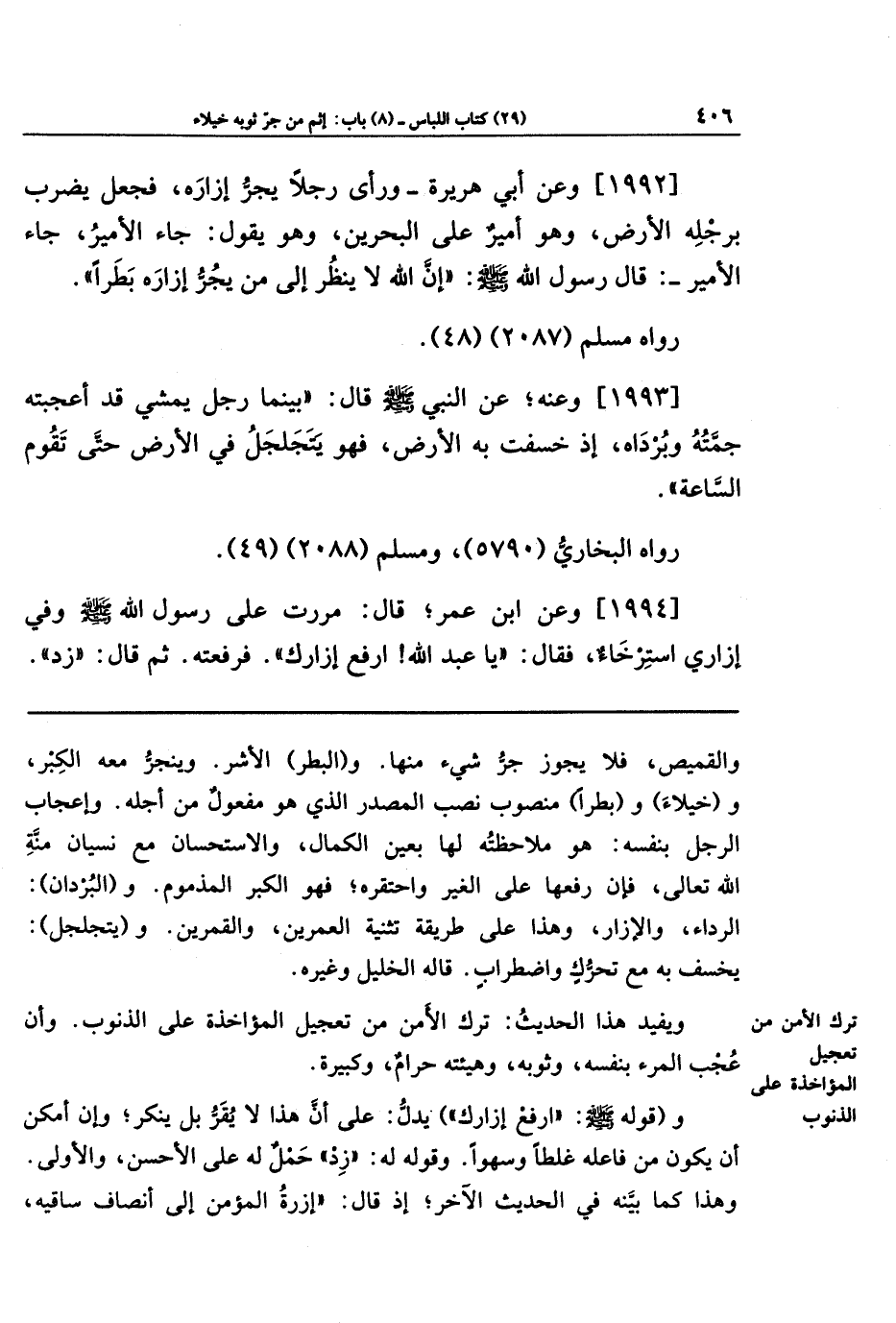 [1992] وعن أبي هُرَيرَةَ، وَرَأَى رَجُلًا يَجُرُّ إِزَارَهُ، فَجَعَلَ يَضرِبُ بِرِجلِهِ الأَرضَ - وَهُوَ أَمِيرٌ عَلَى البَحرَينِ - وَهُوَ يَقُولُ: جَاءَ الأَمِيرُ، جَاءَ الأَمِيرُ. قَالَ رَسُولُ اللَّهِ صَلَّى اللهُ عَلَيهِ وَسَلَّمَ: إِنَّ اللَّهَ لَا يَنظُرُ إِلَى مَن يَجُرُّ إِزَارَهُ بَطَرًا.