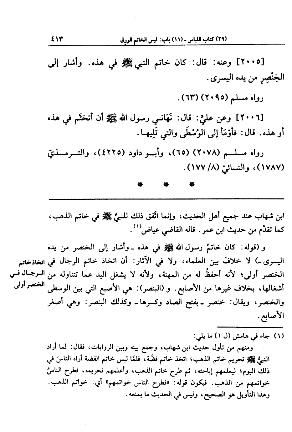 [2005] وعنه قَالَ: كَانَ خَاتِمُ النَّبِي صلى الله عليه وسلم فِي هَذِهِ. وَأَشَارَ إِلَى الخِنصَرِ مِن يَدِهِ اليُسرَى.