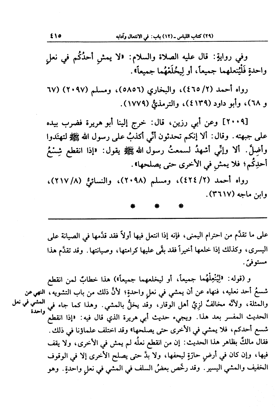 [2009] وعن أَبِي رَزِينٍ قَالَ: خَرَجَ إِلَينَا أَبُو هُرَيرَةَ، فَضَرَبَ بِيَدِهِ عَلَى جَبهَتِهِ وقَالَ: أَلَا إِنَّكُم تَحَدَّثُونَ أَنِّي أَكذِبُ عَلَى رَسُولِ اللَّهِ صَلَّى اللَّهُ عَلَيهِ وَسَلَّمَ لِتَهتَدُوا وَأَضِلَّ، أَلَا وَإِنِّي أَشهَدُ لَسَمِعتُ رَسُولَ اللَّهِ صَلَّى اللَّهُ عَلَيهِ وَسَلَّمَ يَقُولُ: إِذَا انقَطَعَ شِسعُ أَحَدِكُم، فَلَا يَمشِ فِي الأُخرَى حَتَّى يُصلِحَهَا.