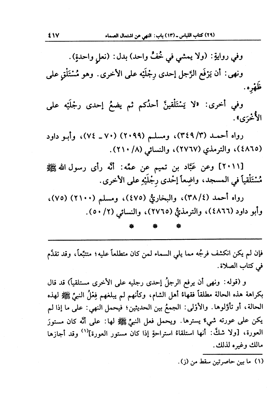 ونهى: أَن يَرفَعَ الرَّجُلُ إِحدَى رِجلَيهِ عَلَى الأُخرَى وَهُوَ مُستَلقٍ عَلَى ظَهرِهِ.
