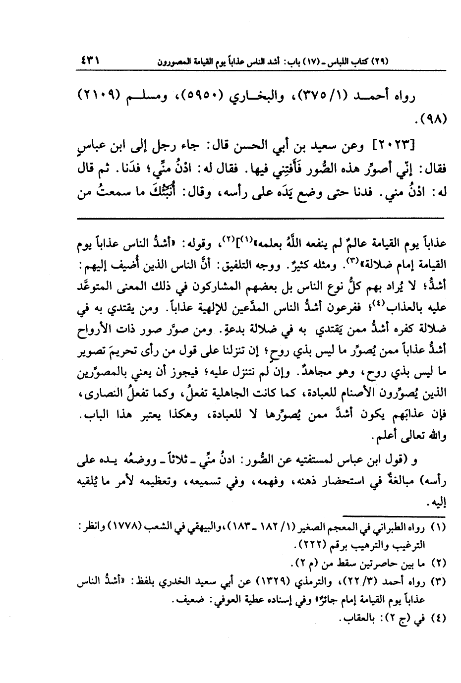 [2023] وعَن سَعِيدِ بنِ أَبِي الحَسَنِ قَالَ: جَاءَ رَجُلٌ إِلَى ابنِ عَبَّاسٍ فَقَالَ: إِنِّي أُصَوِّرُ هَذِهِ الصُّوَرَ فَأَفتِنِي فِيهَا. فَقَالَ لَهُ: ادنُ مِنِّي، فَدَنَا، ثُمَّ قَالَ له: ادنُ مِنِّي، فَدَنَا حَتَّى وَضَعَ يَدَهُ عَلَى رَأسِهِ، وقَالَ: أُنَبِّئُكَ مَا سَمِعتُ مِن