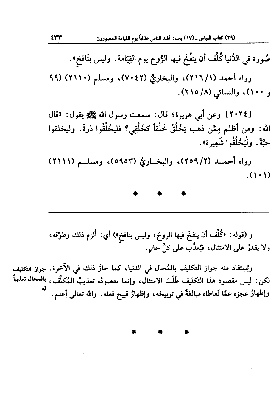 [2024] وعن أَبِي هُرَيرَةَ قَالَ: سَمِعتُ رَسُولَ اللَّهِ صَلَّى اللَّهُ عَلَيهِ وَسَلَّمَ يَقُولُ: قَالَ اللَّهُ: وَمَن أَظلَمُ مِمَّن ذَهَبَ يَخلُقُ خَلقًا كَخَلقِي، فَليَخلُقُوا ذَرَّةً، ولِيَخلُقُوا حَبَّةً، ولِيَخلُقُوا شَعِيرَةً.