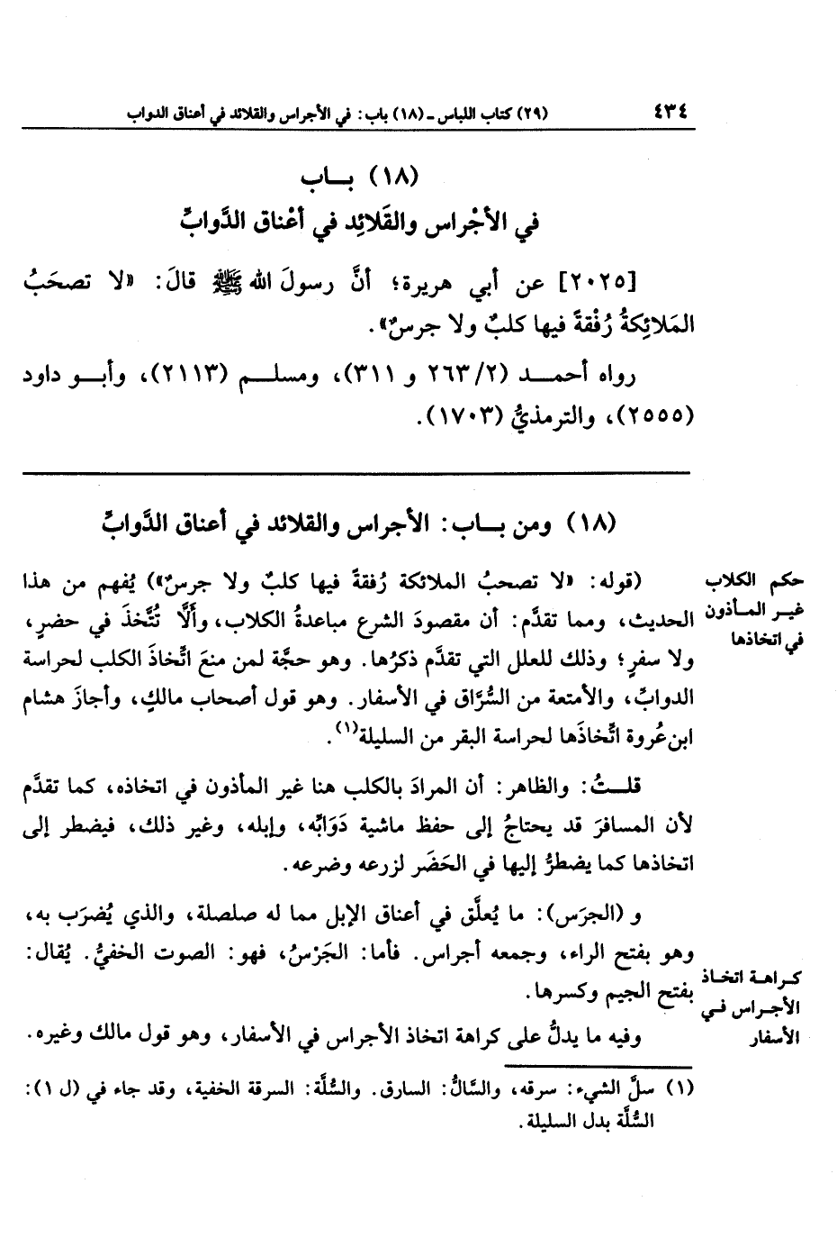 [2025] عَن أَبِي هُرَيرَةَ: أَنَّ رَسُولَ اللَّهِ صَلَّى اللَّهُ عَلَيهِ وَسَلَّمَ قَالَ: لَا تَصحَبُ المَلَائِكَةُ رُفقَةً فِيهَا كَلبٌ وَلَا جَرَسٌ.