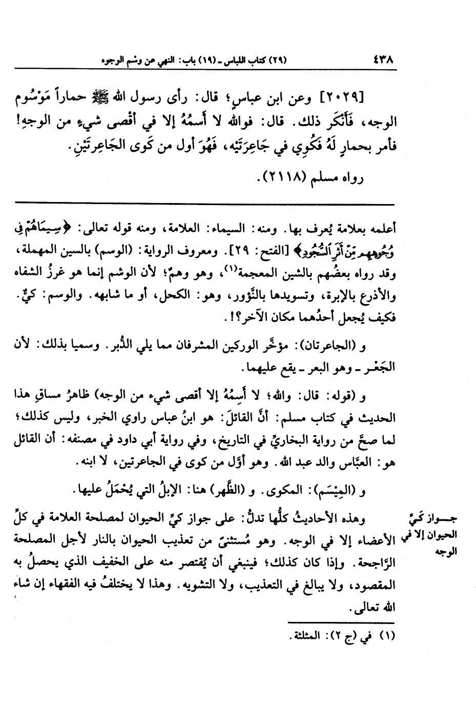[2029] وعن ابنَ عَبَّاسٍ قال: رَأَى رَسُولُ اللَّهِ صَلَّى اللَّهُ عَلَيهِ وَسَلَّمَ حِمَارًا مَوسُومَ الوَجهِ، فَأَنكَرَ ذَلِكَ. قَالَ: فَوَاللَّهِ لَا أَسِمُهُ إِلَّا فِي أَقصَى شَيءٍ مِن الوَجهِ، فَأَمَرَ بِحِمَارٍ لَهُ فَكُوِيَ فِي جَاعِرَتَيهِ، فَهُوَ أَوَّلُ مَن كَوَى الجَاعِرَتَينِ.