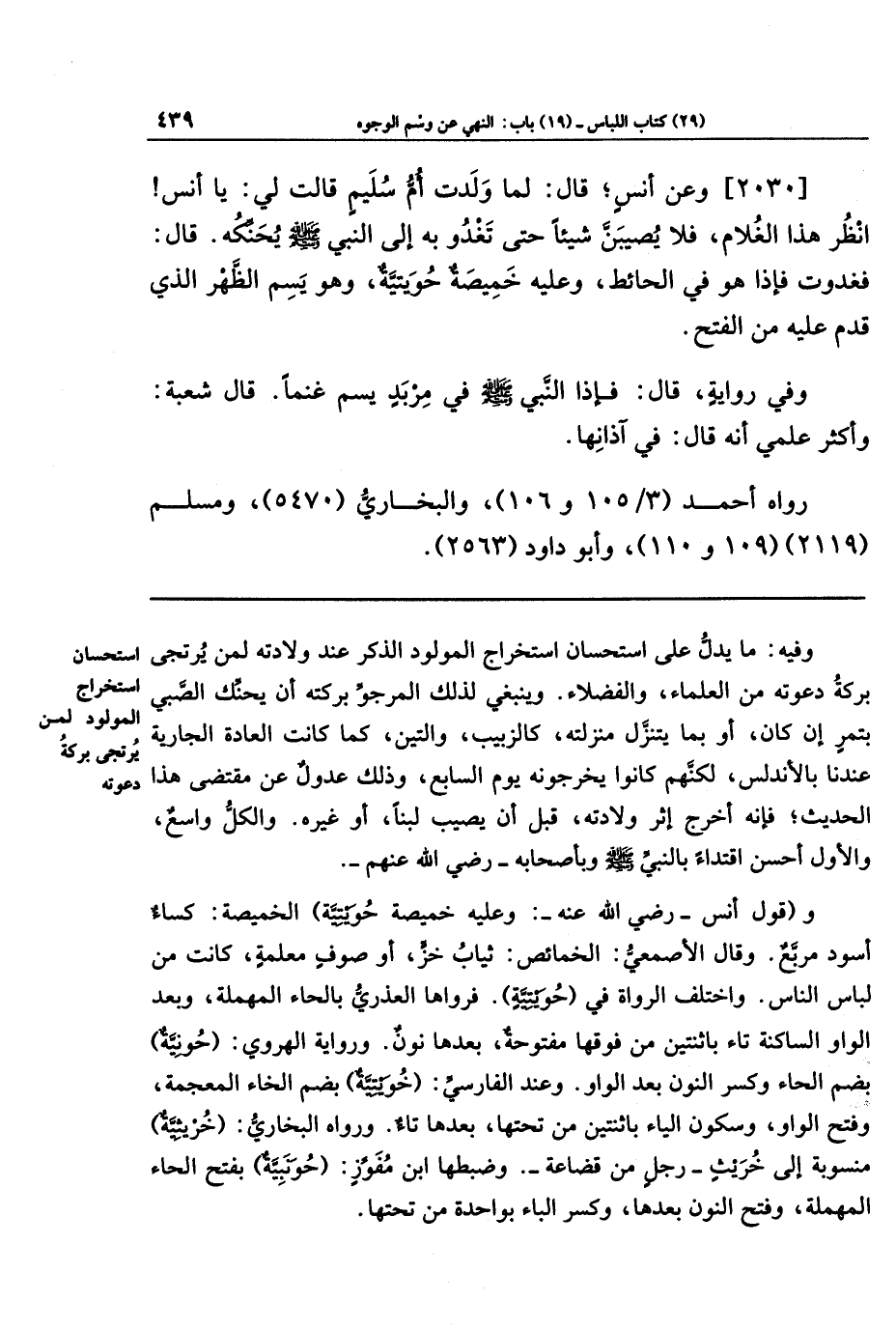 [2030] وعن أَنَسٍ قَالَ: لَمَّا وَلَدَت أُمُّ سُلَيمٍ قَالَت لِي: يَا أَنَسُ، انظُر هَذَا الغُلَامَ، فَلَا يُصِيبَنَّ شَيئًا حَتَّى تَغدُوَ بِهِ إِلَى النَّبِيِّ صَلَّى اللَّهُ عَلَيهِ وَسَلَّمَ يُحَنِّكُهُ. قَالَ: فَغَدَوتُ، فَإِذَا هُوَ فِي الحَائِطِ وَعَلَيهِ خَمِيصَةٌ حُوَيتِيَّةٌ، وَهُوَ يَسِمُ الظَّهرَ الَّذِي قَدِمَ عَلَيهِ من الفَتحِ.