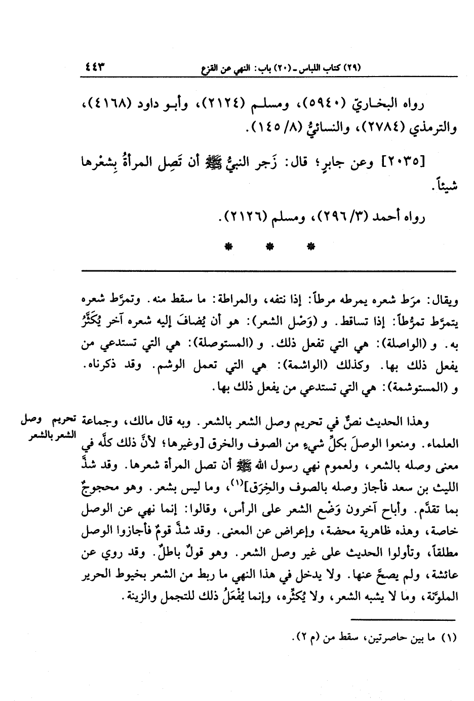 [2035] وعن جَابِرٍ قال: زَجَرَ النَّبِيُّ صَلَّى اللَّهُ عَلَيهِ وَسَلَّمَ أَن تَصِلَ المَرأَةُ بِشعرهَا شَيئًا.