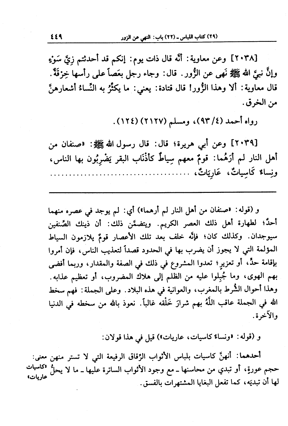 [2039] وعَن أَبِي هُرَيرَةَ قَالَ: قَالَ رَسُولُ اللَّهِ صَلَّى اللهُ عَلَيهِ وَسَلَّمَ: صِنفَانِ مِن أَهلِ النَّارِ لَم أَرَهُمَا: قَومٌ مَعَهُم سِيَاطٌ كَأَذنَابِ البَقَرِ يَضرِبُونَ بِهَا النَّاسَ، وَنِسَاءٌ كَاسِيَاتٌ عَارِيَاتٌ،