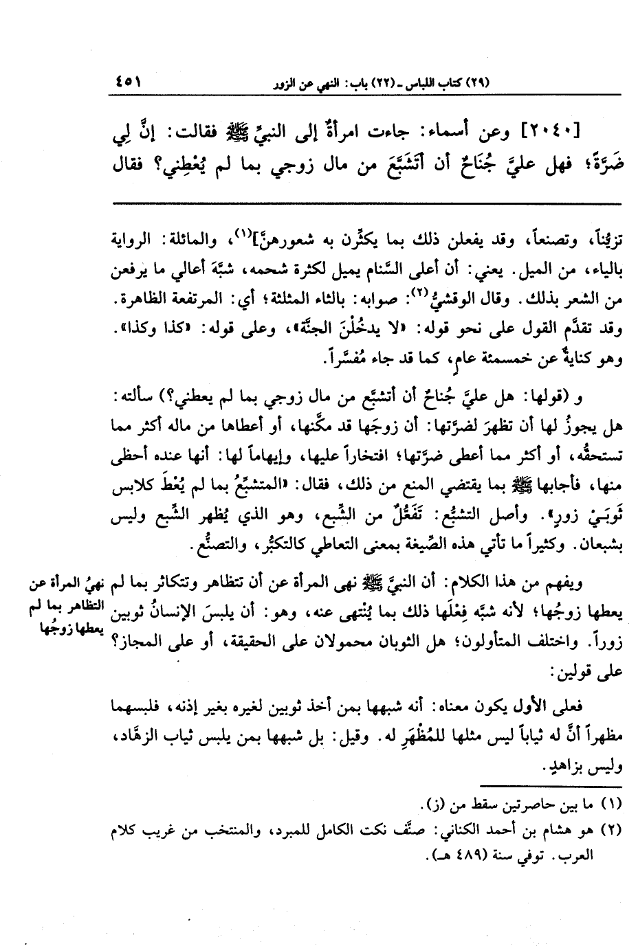 وقولها: (هل علي جناح أن أتشبَّع من مال زوجي بما لم يعطني؟ ) سألته: هل يجوز لها أن تظهر لضرتها: أن زوجها قد مكنها، أو أعطاها من ماله أكثر مما تستحقه، أو أكثر مما أعطى ضرتها؛ افتخارًا عليها، وإيهامًا لها أنها عنده أحظى منها، فأجابها - صلى الله عليه وسلم - بما يقتضي المنع من ذلك، فقال: (المتشبِّع بما لم يُعط كلابس ثوبي زور) وأصل التشبُّع: تفعُّل من الشِّبع، وهو الذي يظهر الشِّبع وليس بشبعان. وكثيرًا ما تأتي هذه الصيغة بمعنى التعاطي كالتكبُّر، والتصنُّع.