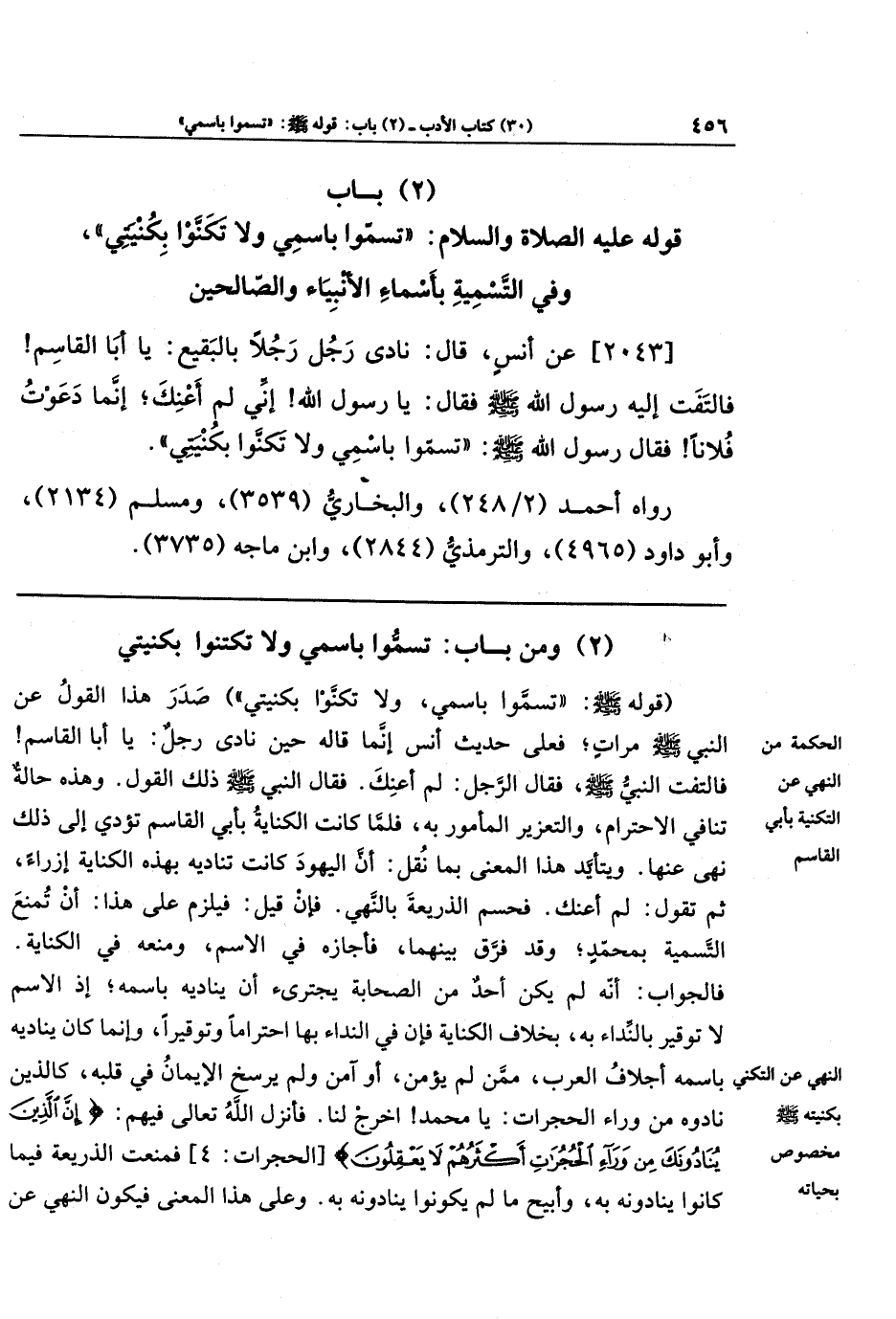 [2043] عَن أَنَسٍ قَالَ: نَادَى رَجُلٌ رَجُلًا بِالبَقِيعِ: يَا أَبَا القَاسِمِ، فَالتَفَتَ إِلَيهِ رَسُولُ اللَّهِ صلى الله عليه وسلم، فَقَالَ: يَا رَسُولَ اللَّهِ، إِنِّي لَم أَعنِكَ، إِنَّمَا دَعَوتُ فُلَانًا. فَقَالَ رَسُولُ اللَّهِ صَلَّى اللهُ عَلَيهِ وَسَلَّمَ: تَسَمَّوا بِاسمِي، وَلَا تَكَنَّوا بِكُنيَتِي.
