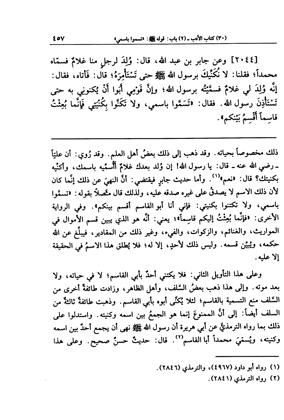 [2044] وعَن جَابِرِ بنِ عَبدِ اللَّهِ قَالَ: وُلِدَ لِرَجُلٍ مِنَّا غُلَامٌ فَسَمَّاهُ مُحَمَّدًا، فَقُلنَا: لَا نَكنيكَ بِرَسُولِ اللَّهِ صَلَّى اللَّهُ عَلَيهِ وَسَلَّمَ حَتَّى تَستَأمِرَهُ. قَالَ: فَأَتَاهُ فَقَالَ: إِنَّهُ وُلِدَ لِي غُلَامٌ فَسَمَّيتُهُ بِرَسُولِ اللَّهِ، وَإِنَّ قَومِي أَبَوا أَن يَكنُونِي بِهِ حَتَّى تَستَأذِنَ رَسُولَ اللَّه. فَقَالَ: تسَمَّوا بِاسمِي، وَلَا تَكَنَّوا بِكُنيَتِي، فَإِنَّمَا بُعِثتُ قَاسِمًا أَقسِمُ بَينَكُم.