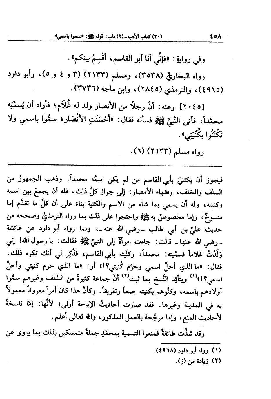 [2045] وعنه: أَنَّ رَجُلًا مِن الأَنصَارِ وُلِدَ لَهُ غُلَامٌ فَأَرَادَ أَن يُسَمِّيَهُ مُحَمَّدًا، فَأَتَى النَّبِيَّ صَلَّى اللَّهُ عَلَيهِ وَسَلَّمَ فَسَأَلَهُ فَقَالَ: أَحسَنَت الأَنصَارُ، سَمُّوا بِاسمِي وَلَا تَكتَنُوا بِكُنيَتِي.