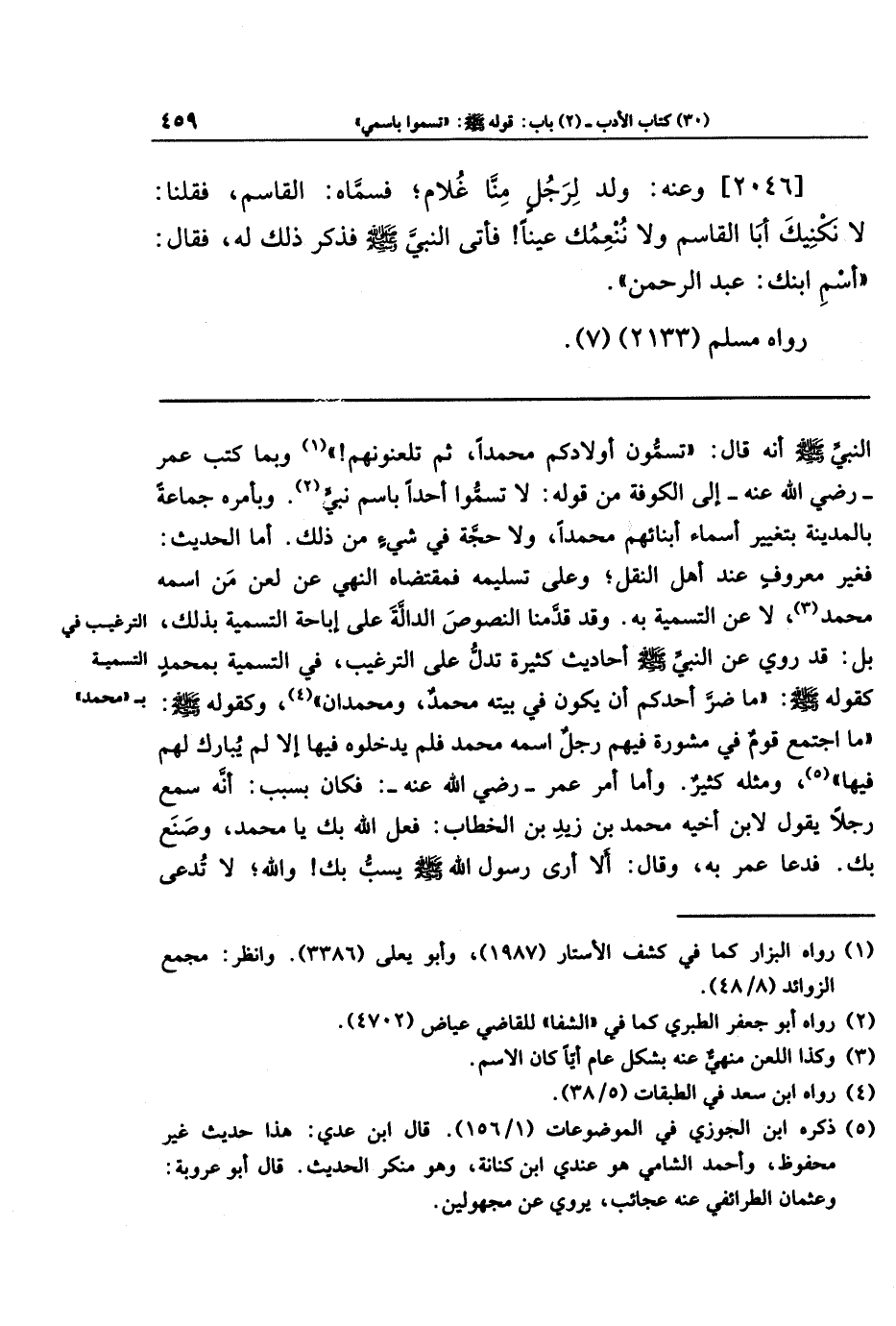 [2046] وعنه: وُلِدَ لِرَجُلٍ مِنَّا غُلَامٌ؛ فَسَمَّاهُ القَاسِمَ، فَقُلنَا: لَا نَكنِيكَ أَبَا القَاسِمِ، وَلَا نُنعِمُكَ عَينًا. فَأَتَى النَّبِيَّ صَلَّى اللَّهُ عَلَيهِ وَسَلَّمَ فَذَكَرَ ذَلِكَ لَهُ فَقَالَ: أَسمِ ابنَكَ عَبدَ الرَّحمَنِ.