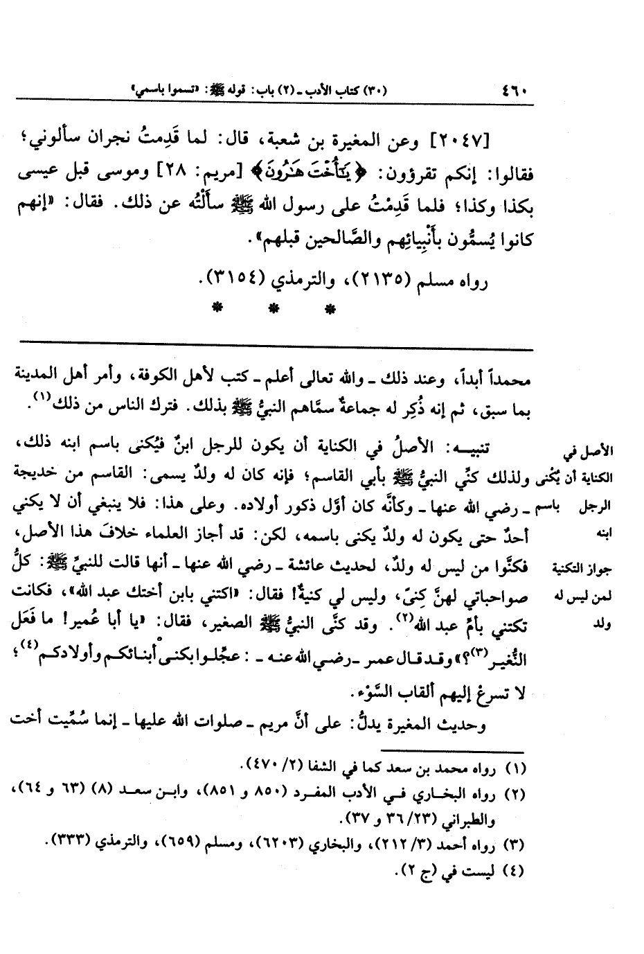 [2047] وعَن المُغِيرَةِ بنِ شُعبَةَ قَالَ: لَمَّا قَدِمتُ نَجرَانَ سَأَلُونِي فَقَالَوا: إِنَّكُم تَقرَءُونَ: يَا أُختَ هَارُونَ، وَمُوسَى قَبلَ عِيسَى بِكَذَا وَكَذَا. فَلَمَّا قَدِمتُ عَلَى رَسُولِ اللَّهِ صَلَّى اللَّهُ عَلَيهِ وَسَلَّمَ سَأَلتُهُ عَن ذَلِكَ. فَقَالَ: إِنَّهُم كَانُوا يُسَمُّونَ بِأَنبِيَائِهِم وَالصَّالِحِينَ قَبلَهُم.